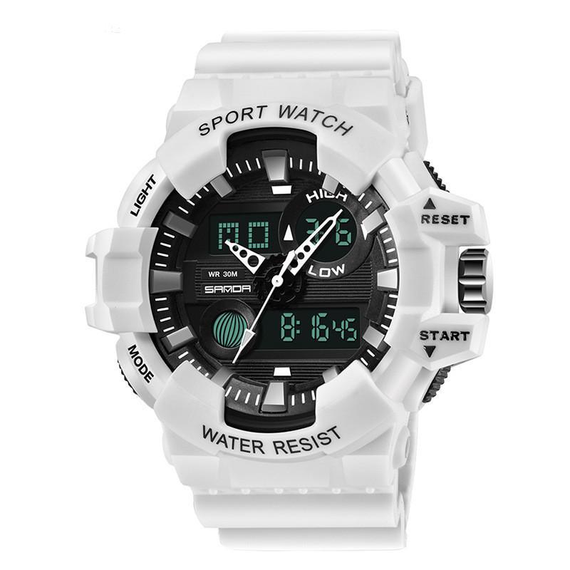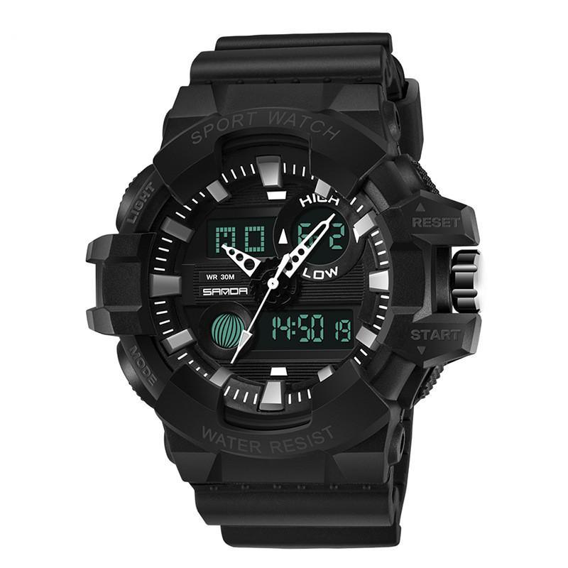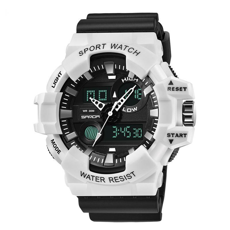 A stylish waterproof electronic watch for men with a large round dial, stainless steel pin buckle, and durable resin strap.