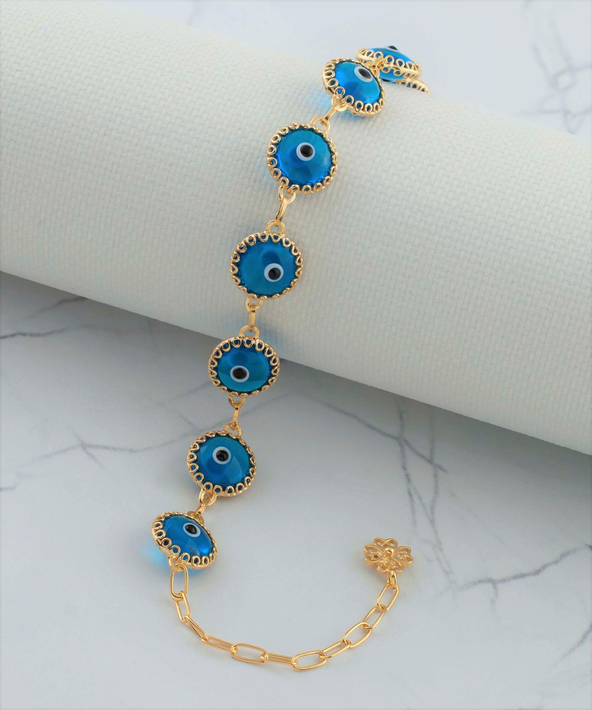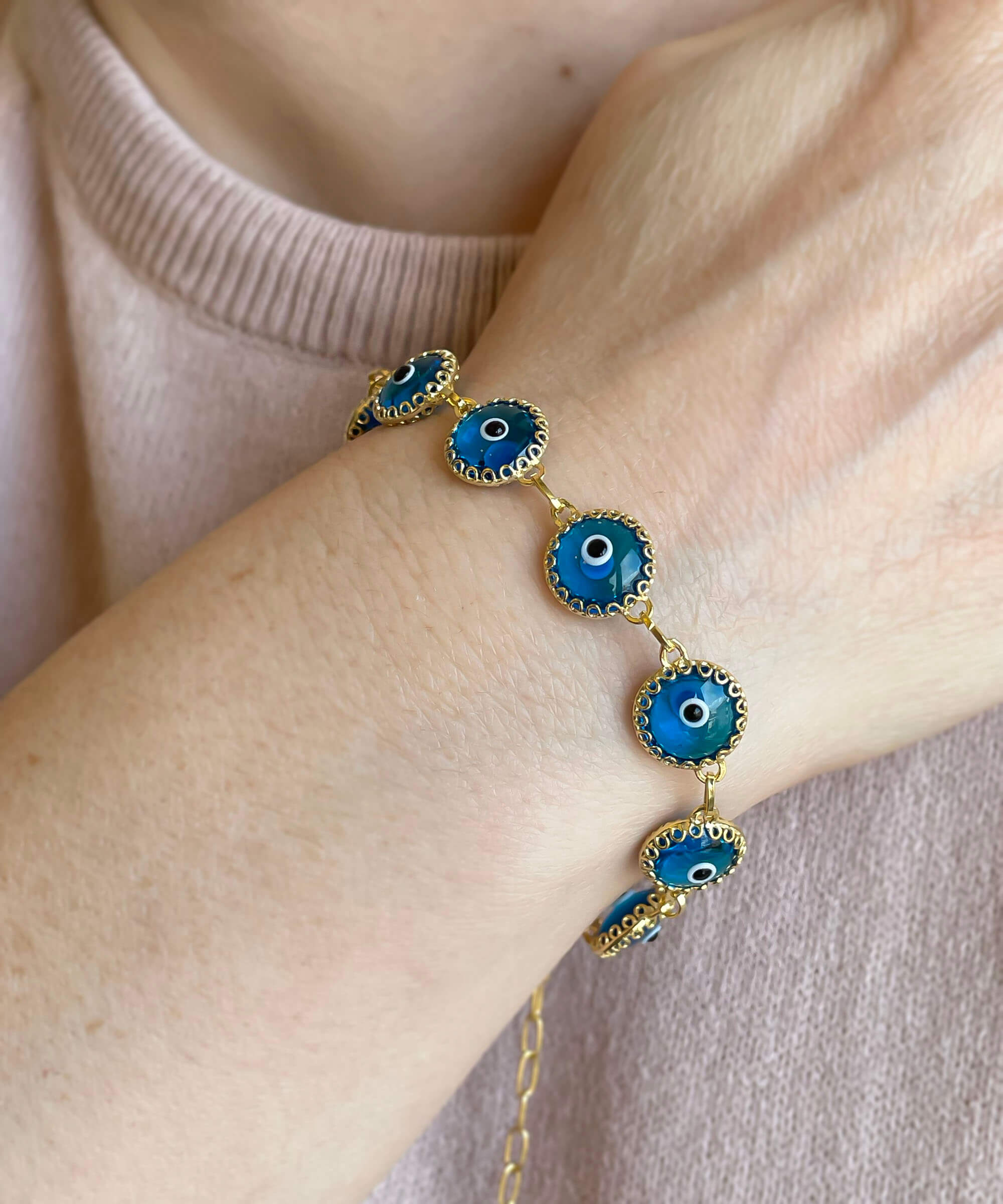 Introducing our stunning Lapis Blue Evil Eye Women Gold Plated Silver Link Bracelet, a perfect blend of elegance and protection. This exquisite bracelet is designed to not only enhance your style but also to serve as a powerful amulet against negativity. Crafted from high-quality gold-plated sterling silver, this bracelet features a strong rolo chain that ensures durability and comfort.