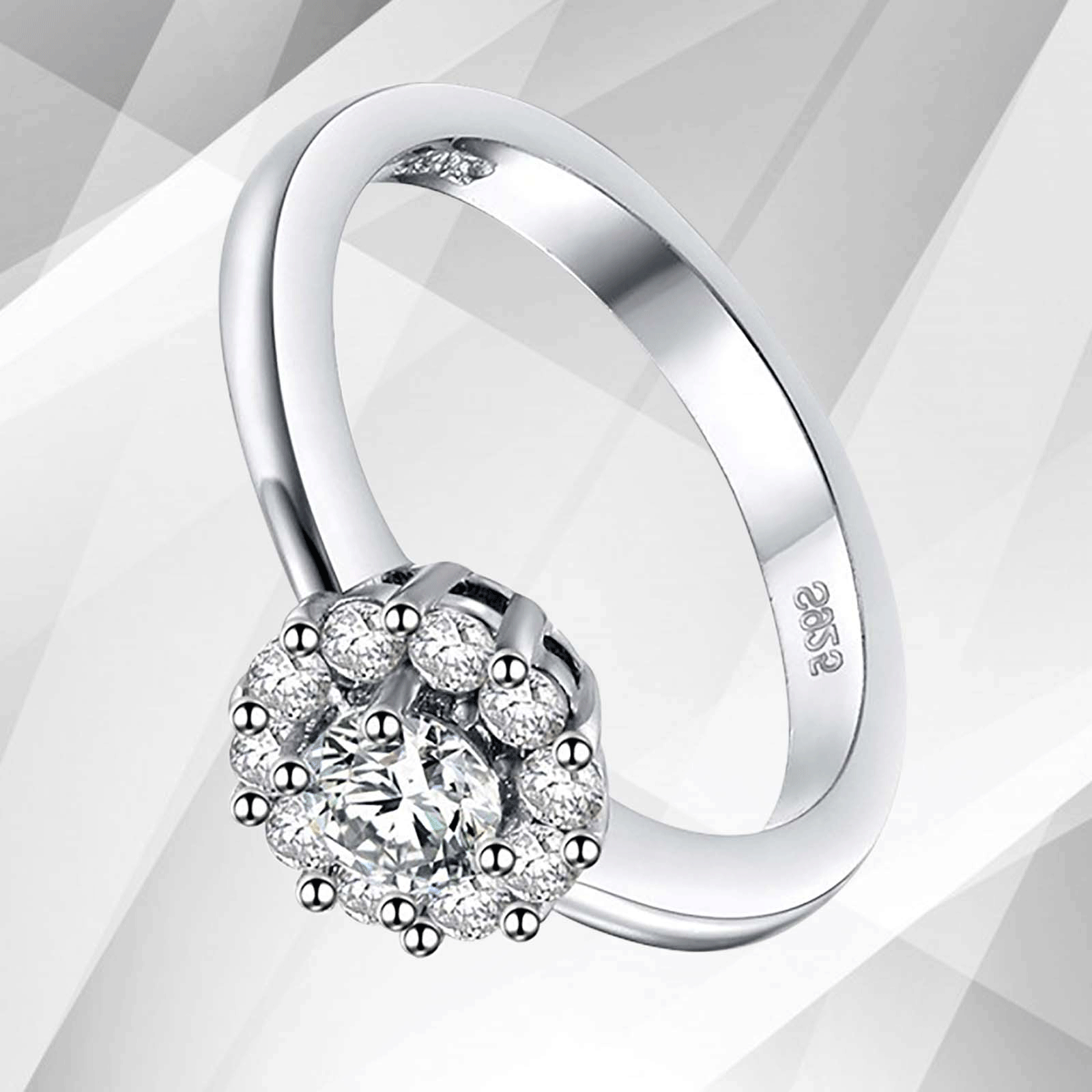 Our engagement ring is made from high-quality brass, finished with a luxurious 18Ct white gold overlay. This combination not only enhances the ring's aesthetic appeal but also ensures durability and longevity. The ring features a total carat weight of approximately 1.70Ct, with 11 dazzling round-cut CZ diamonds that are lab-grown to perfection. Each diamond is carefully selected for its clarity and color, rated at AAA and D respectively, ensuring that you receive a product of the highest quality.