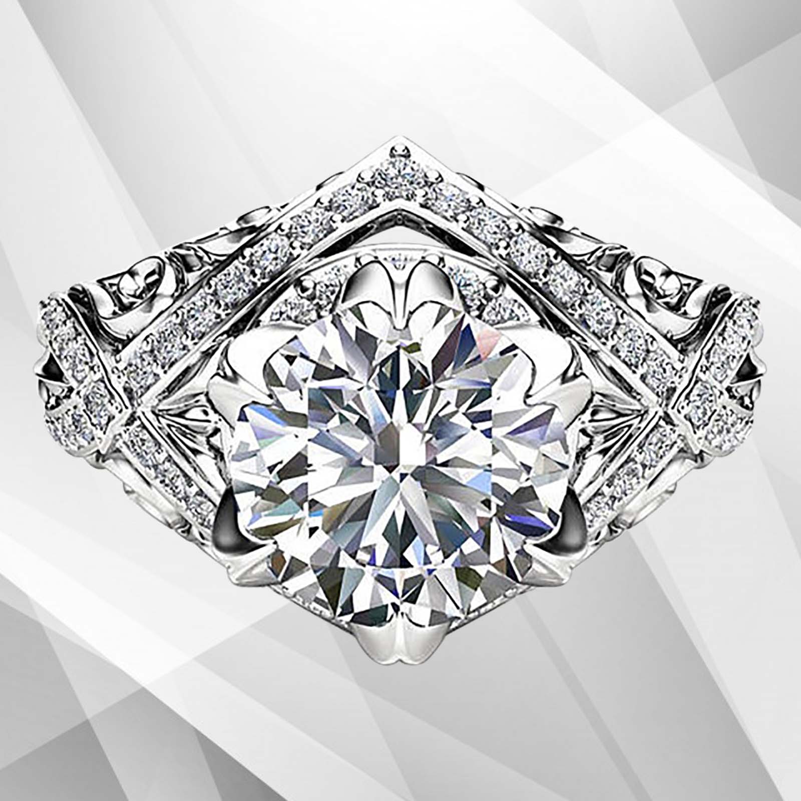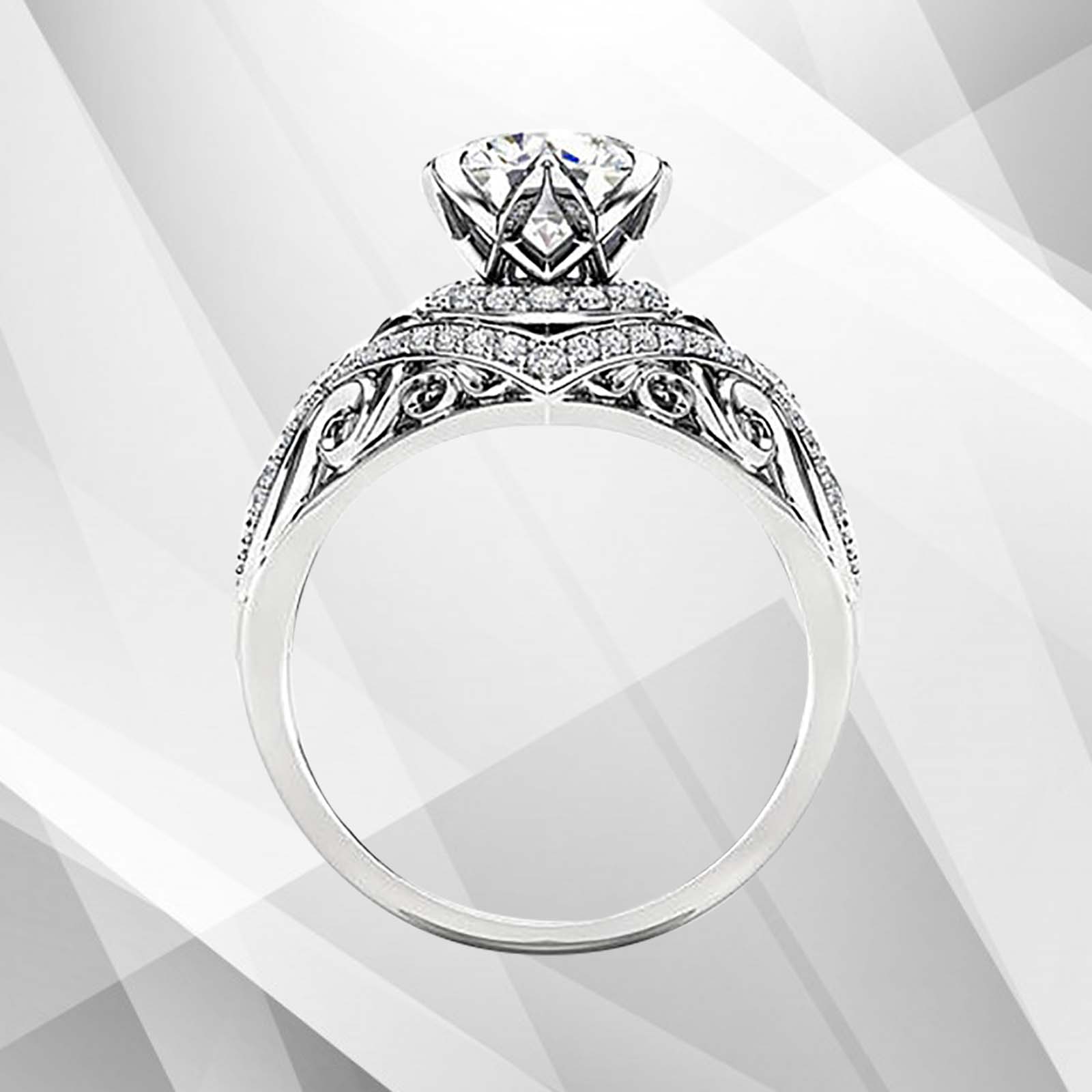 Our engagement ring showcases exceptional craftsmanship, with each diamond carefully selected for its brilliance and clarity. The round-cut diamonds are set in a classic prong setting, allowing maximum light to enter and enhance their sparkle. The 18k white gold over brass provides a stunning backdrop that complements the diamonds beautifully.