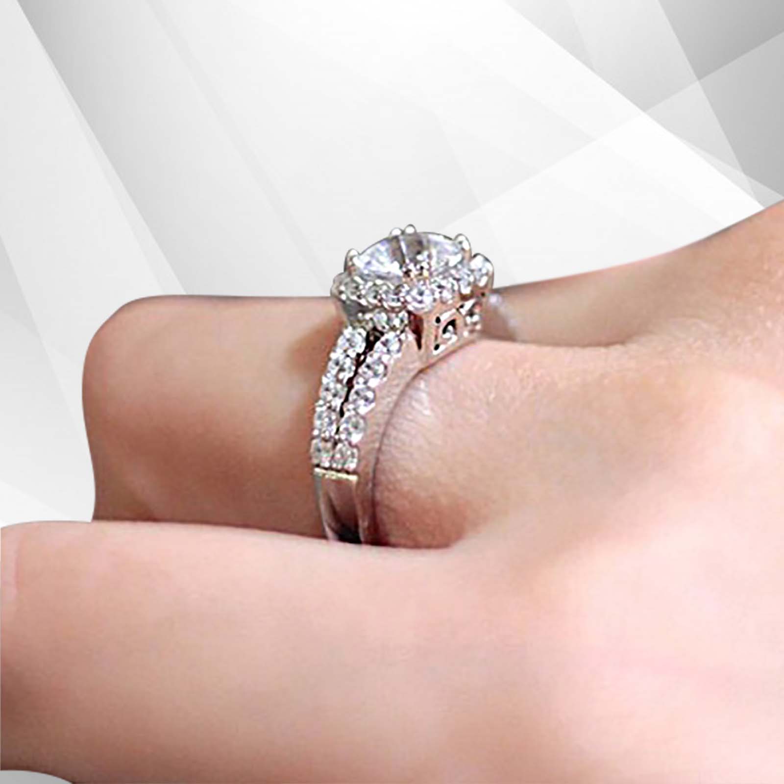 Our engagement ring is made from high-quality materials, including a durable brass base that is elegantly finished with 18K white gold. This combination not only provides a luxurious look but also ensures that the ring withstands the test of time. The halo pave setting showcases a total of 37 stones, each meticulously placed to create a breathtaking display of brilliance.