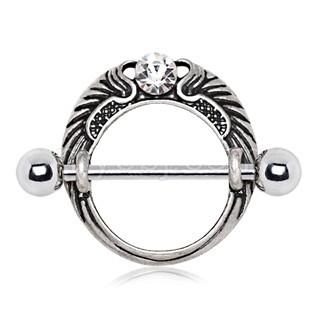 The angel wing design is intricately detailed, showcasing two beautifully crafted wings that cradle a round clear cubic zirconia (CZ) stone. The CZ adds a sparkling touch, making this nipple shield a standout accessory. The combination of the angel wings and the shimmering stone creates a unique piece that symbolizes freedom and beauty.
