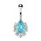 Introducing our exquisite 316L Stainless Steel Aqua Teardrop Navel Ring, a perfect blend of elegance and durability. This stunning belly button ring features a large aqua teardrop cubic zirconia (CZ) that catches the light beautifully, making it an eye-catching accessory for any occasion. The vibrant aqua color is complemented by multiple round clear CZ stones that surround the central teardrop, adding an extra touch of sparkle and sophistication.