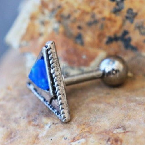 Introducing our exquisite 316L Stainless Steel Blue Synthetic Opal Triangle Cartilage Earring, a perfect blend of style and durability. This cartilage earring features a unique triangle design that adds a touch of elegance to your look. Crafted from high-quality 316L stainless steel, this earring is not only beautiful but also resistant to tarnishing and corrosion, making it ideal for everyday wear.