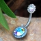 The highlight of this navel ring is undoubtedly the round Aurora Borealis CZ stones, which are strategically placed at both the top and bottom of the ring. These stones are cut to perfection, reflecting light in a mesmerizing way that mimics the natural phenomenon of the Northern Lights. The decorative dots surrounding each CZ add an extra layer of charm and sophistication, making this piece truly unique.