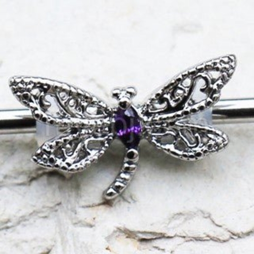 Adding to the allure of the dragonfly is the stunning purple marquise cut cubic zirconia (CZ) that adorns it. This vibrant gemstone adds a pop of color and sparkle, enhancing the overall aesthetic of the barbell. The purple CZ is not only beautiful but also durable, ensuring that it will maintain its brilliance over time.