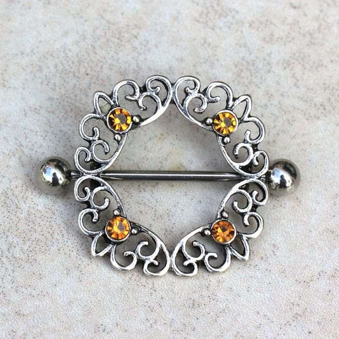 This nipple shield is designed with two rings that accommodate a barbell, allowing for versatile styling options. Whether you want to wear it as a statement piece or pair it with other body jewelry, the 316L Stainless Steel Topaz Ornate Nipple Shield is perfect for any occasion. Its unique design makes it suitable for both casual and formal settings, allowing you to express your individuality and style.