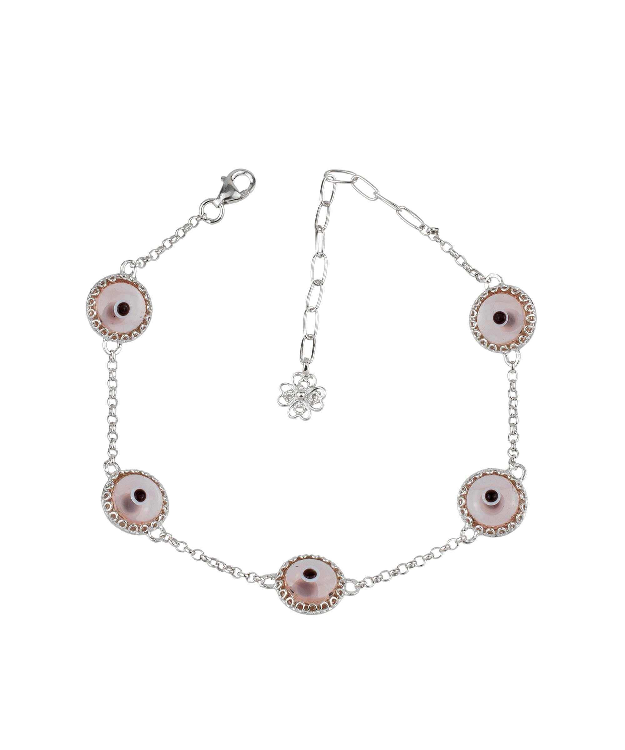 Introducing the exquisite 5 Beads Pink Evil Eye Women Silver Link Bracelet, a stunning piece of jewelry that combines elegance with protective symbolism. Crafted from high-quality sterling silver, this bracelet features a unique design that showcases five beautifully crafted pink evil eye beads. Each bead is meticulously wrapped in 17 silver prongs, ensuring durability and a striking appearance.