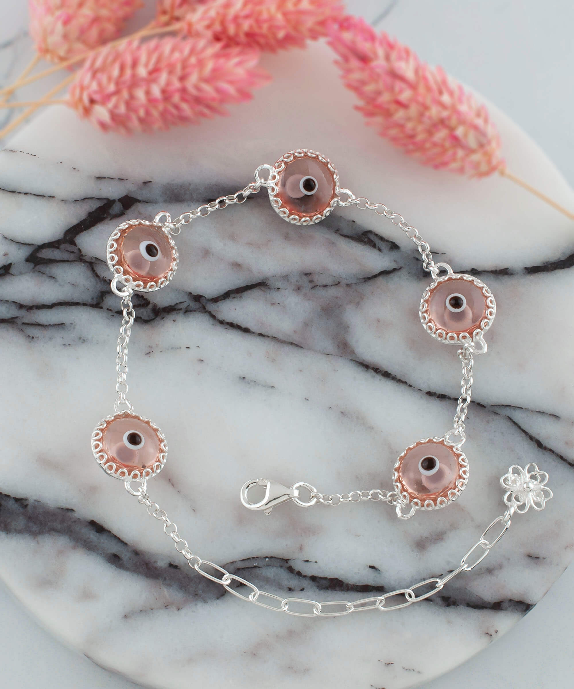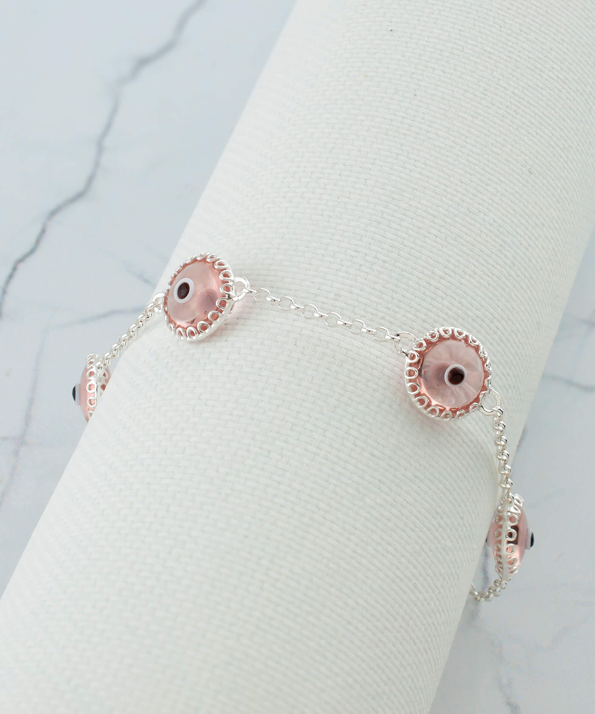 This bracelet is designed by our skilled artisans, who pay close attention to detail and craftsmanship. The strong rolo chain provides a sturdy foundation for the bracelet, ensuring it can withstand daily wear while maintaining its beauty. The pink evil eye beads add a pop of color, making it a versatile accessory that can be paired with various outfits, from casual to formal.