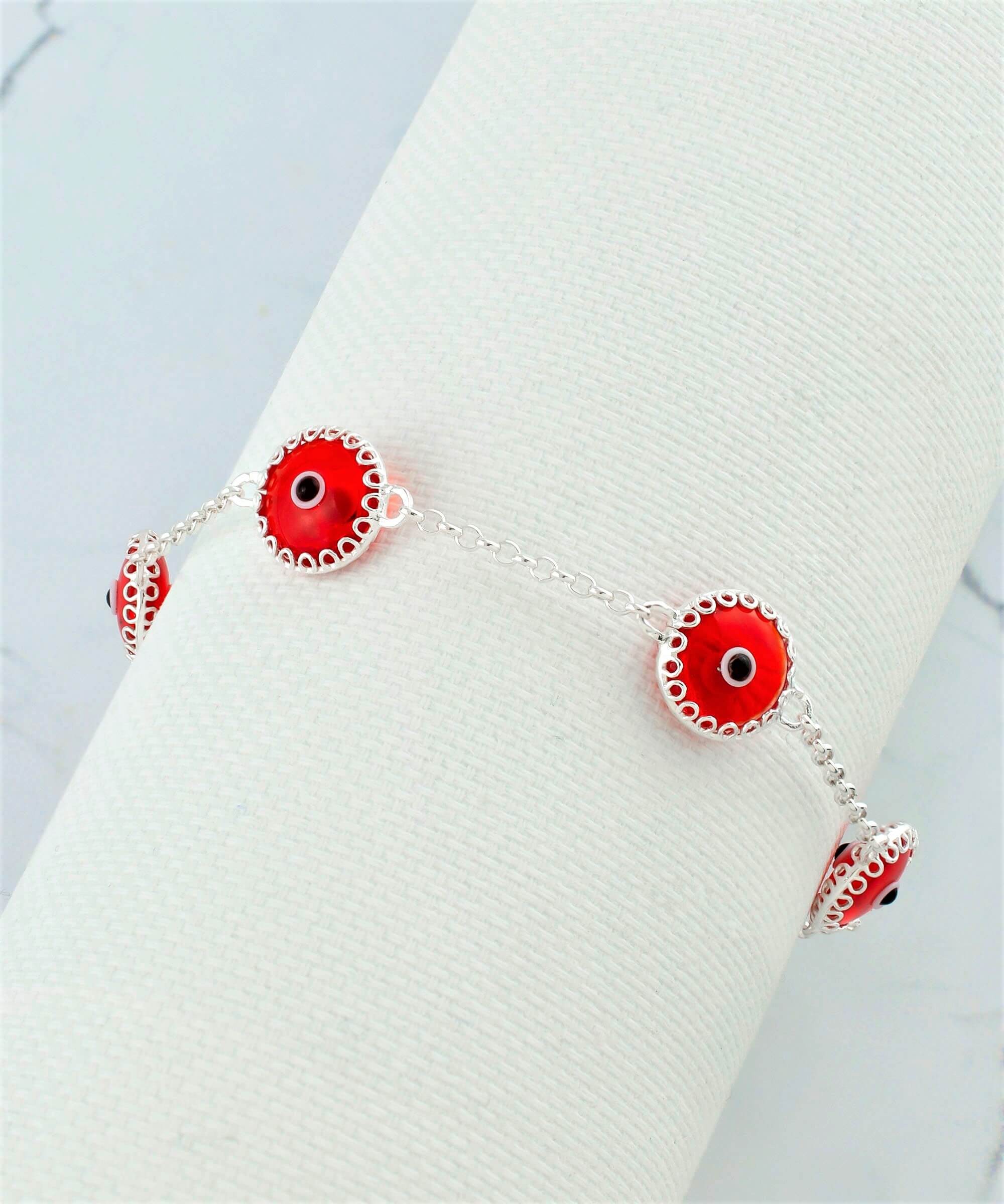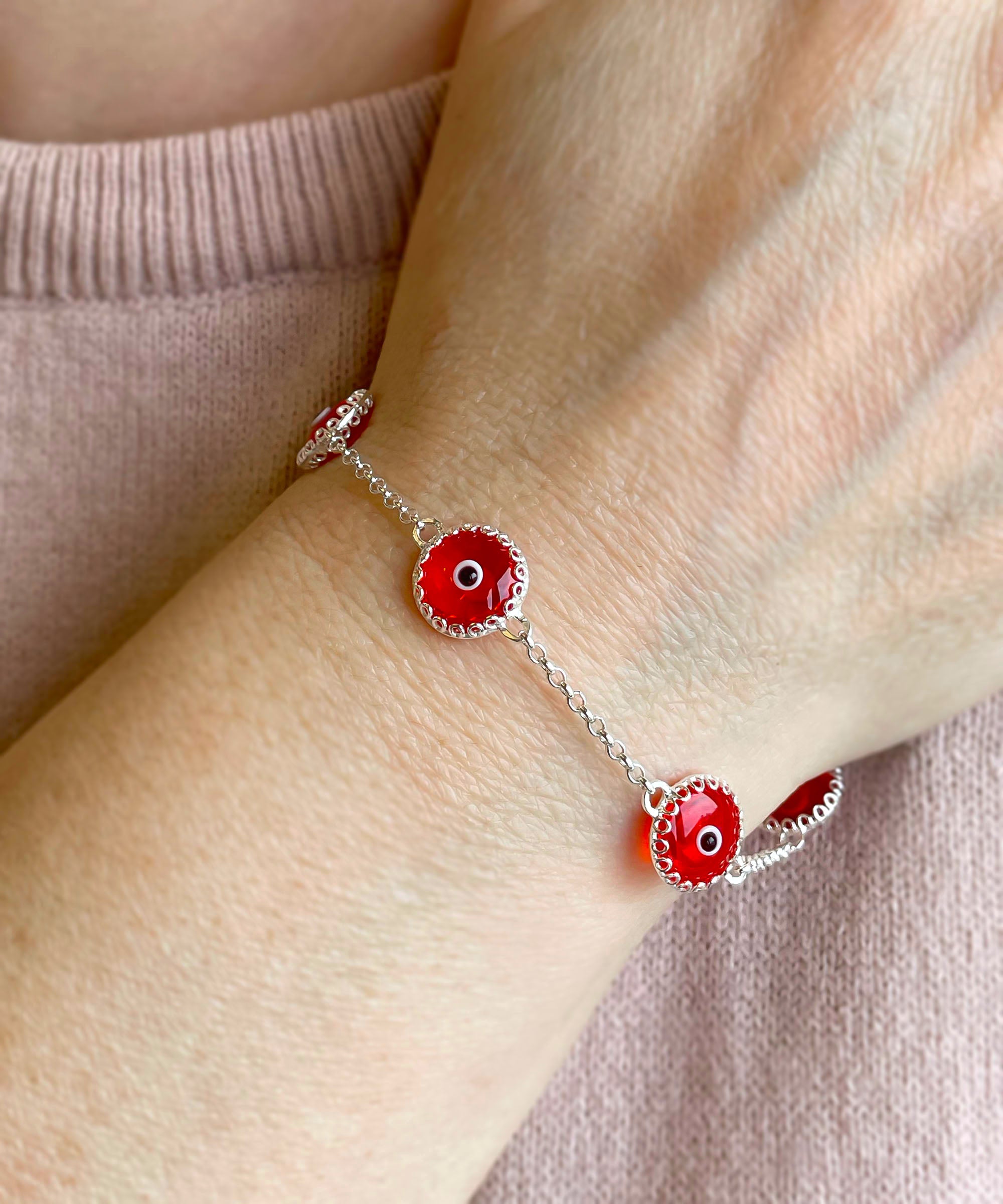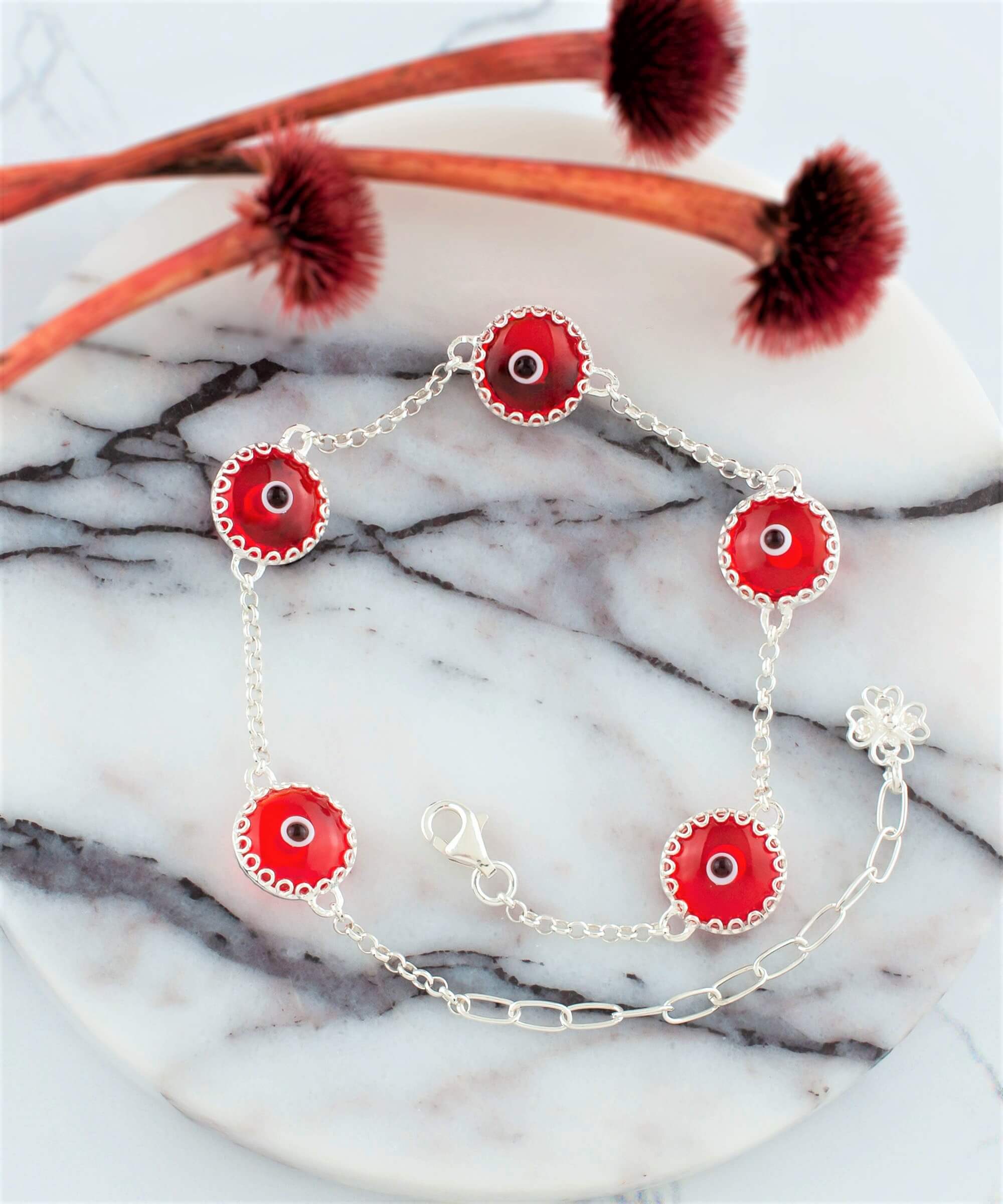 Elevate your jewelry collection with the 5 Beads Scarlet Evil Eye Women Silver Link Bracelet, a perfect blend of style, symbolism, and craftsmanship. Order yours today and experience the beauty and protection it offers!
