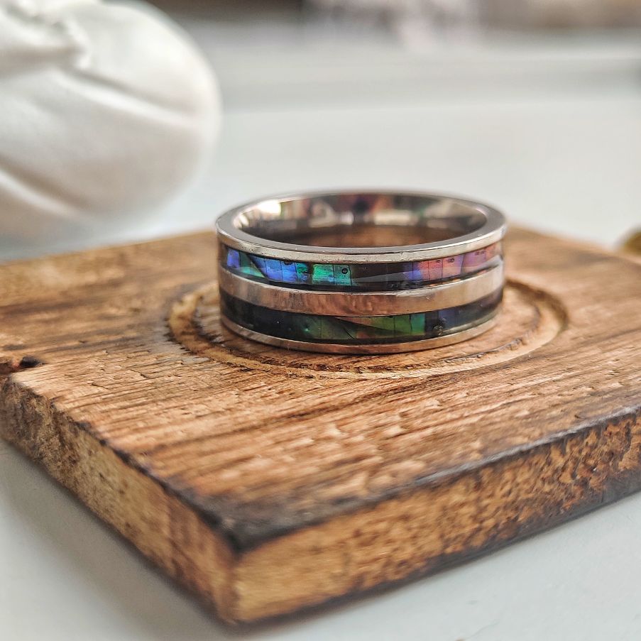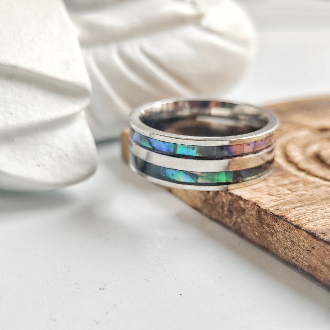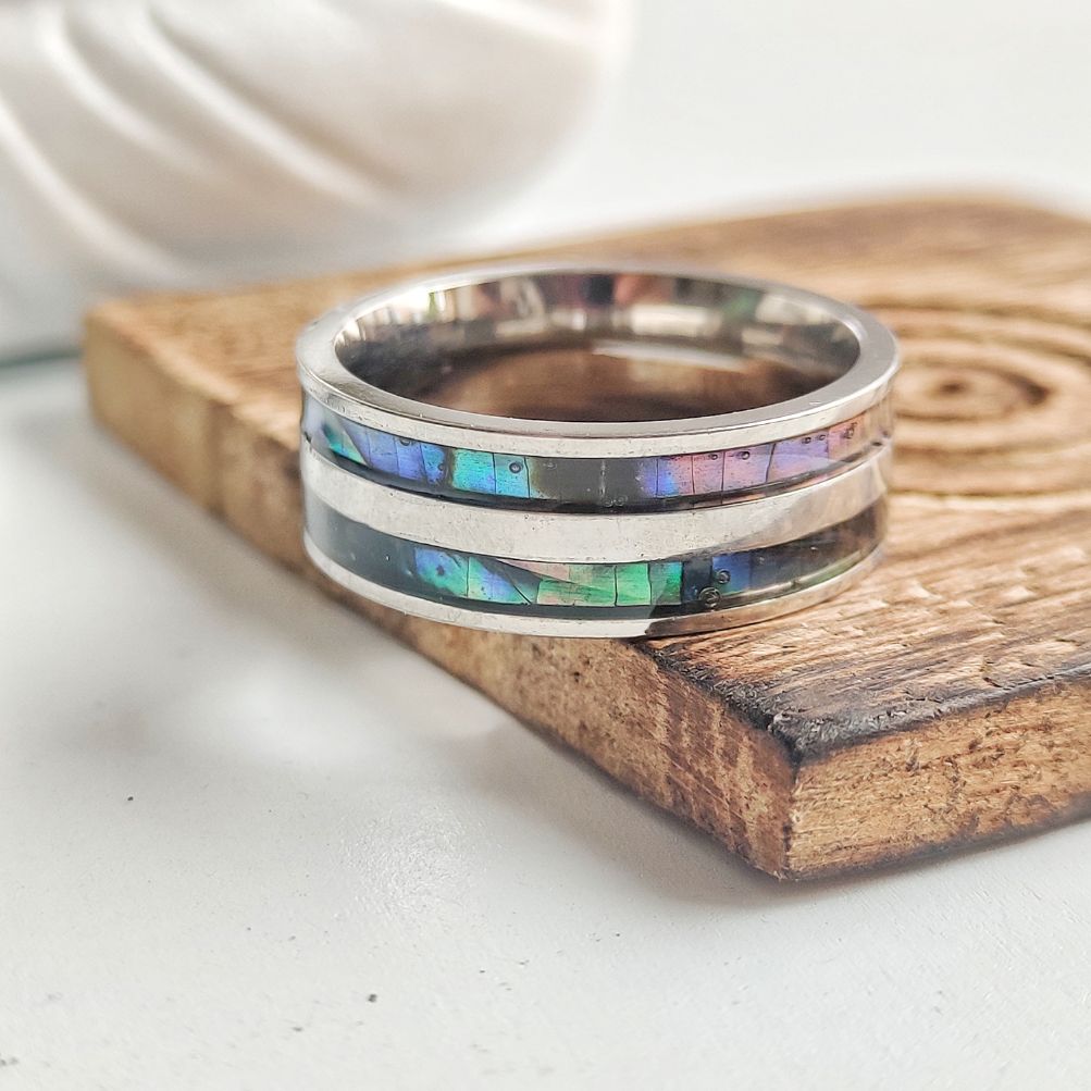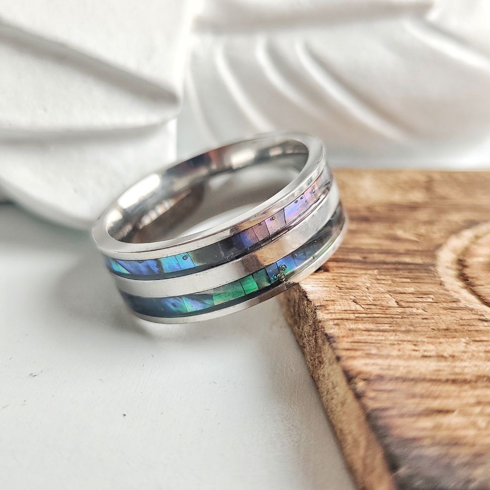 8mm Stainless Steel Unisex Wedding Sea Shell Silver Ring Bands featuring a vibrant abalone shell surrounded by sleek silver bands.