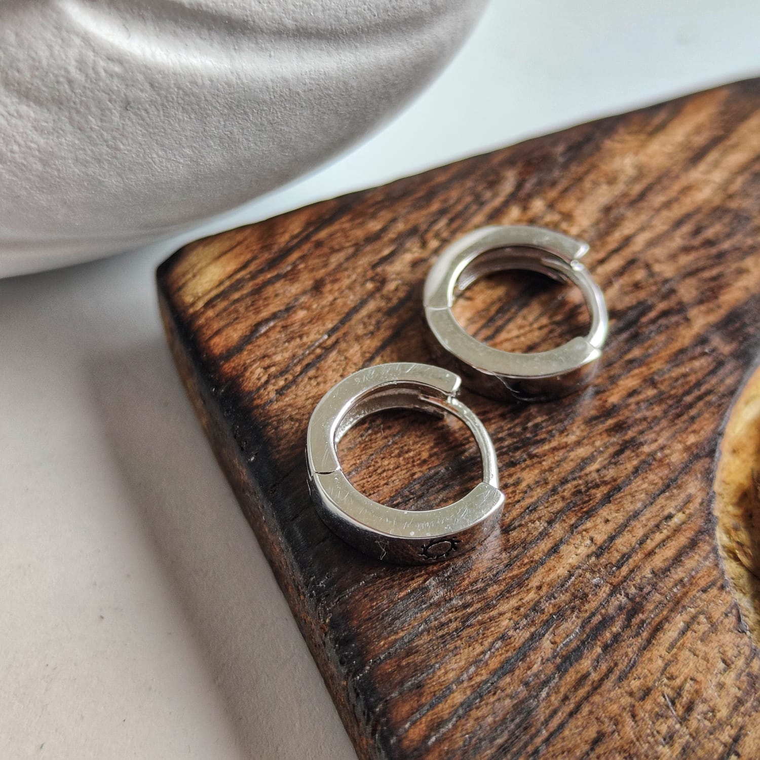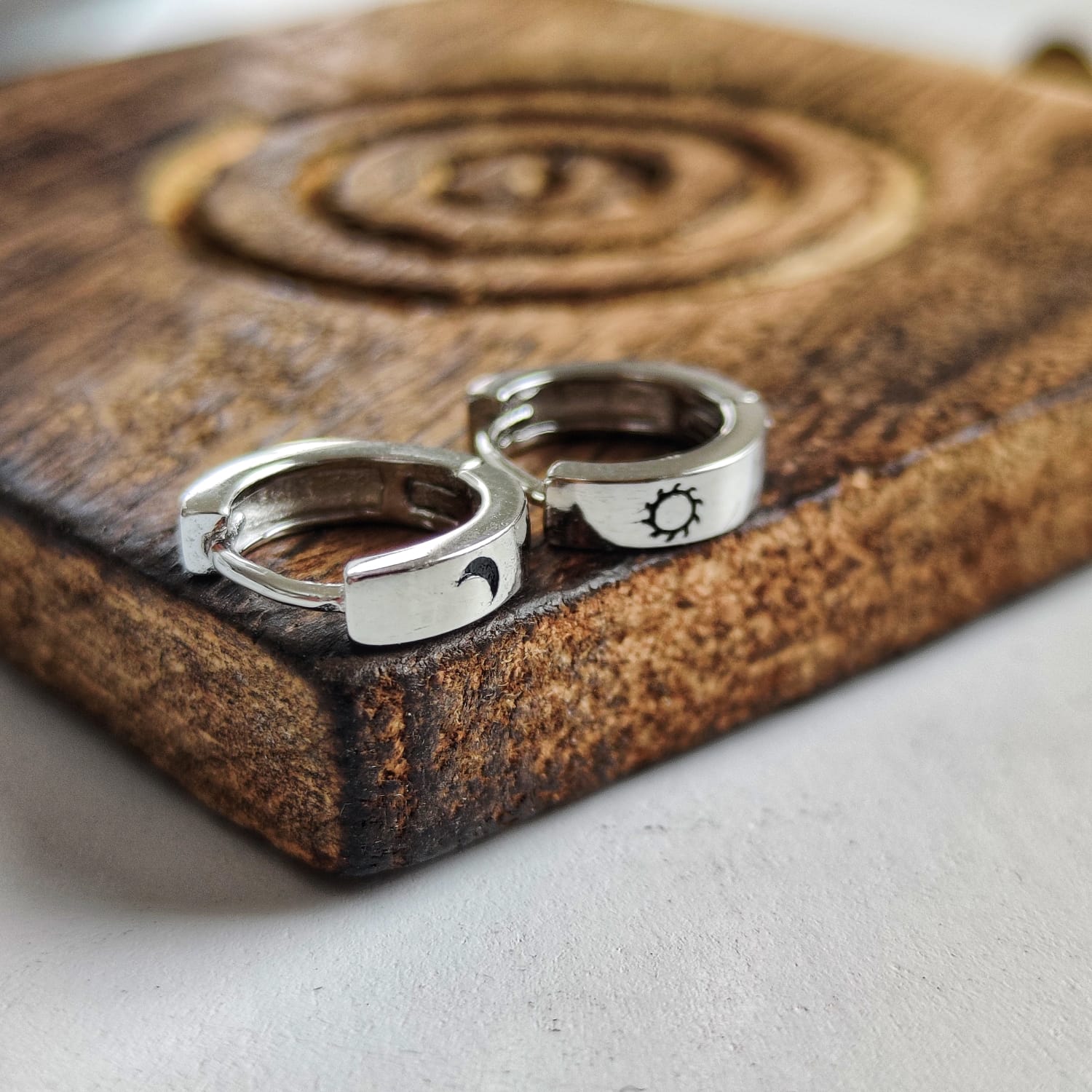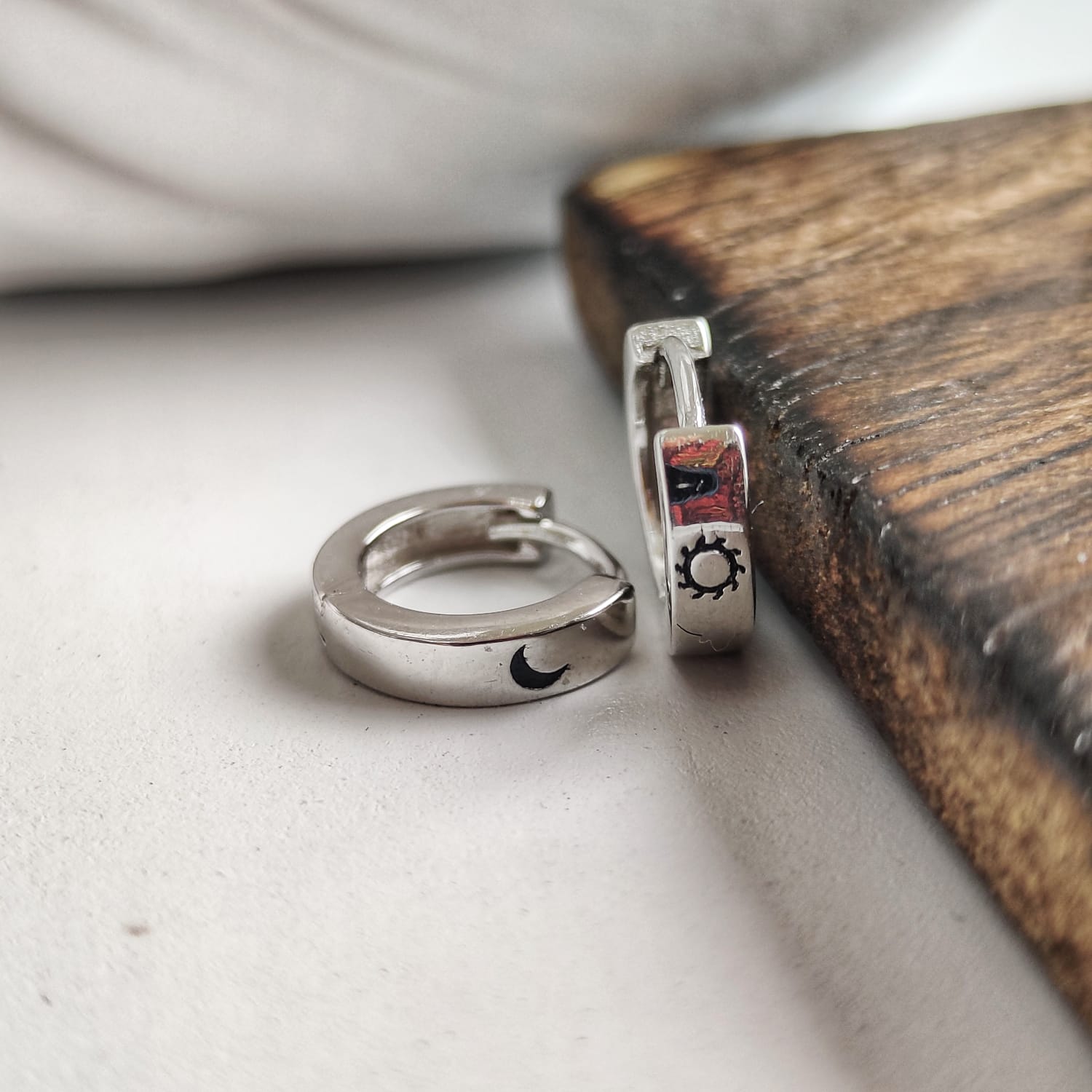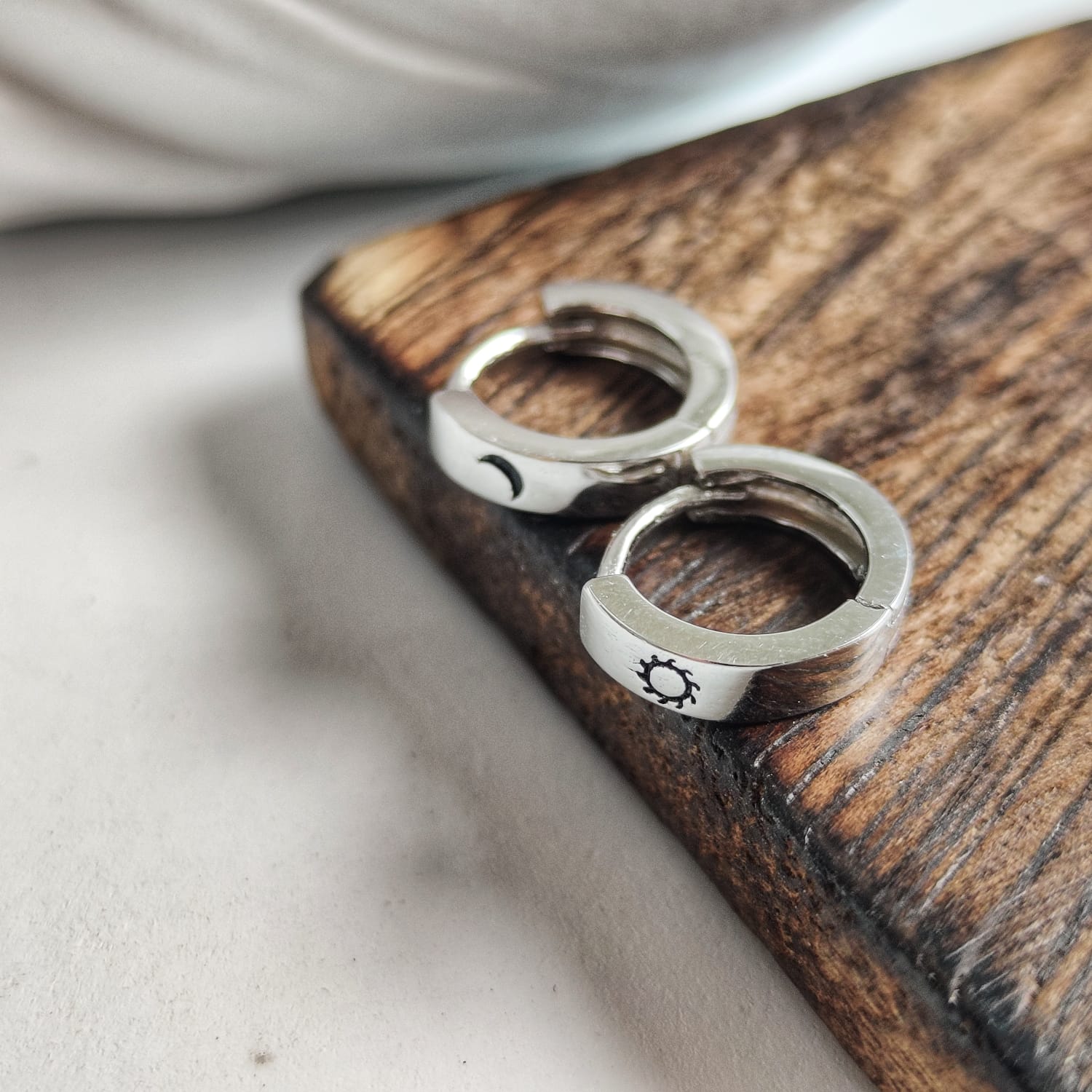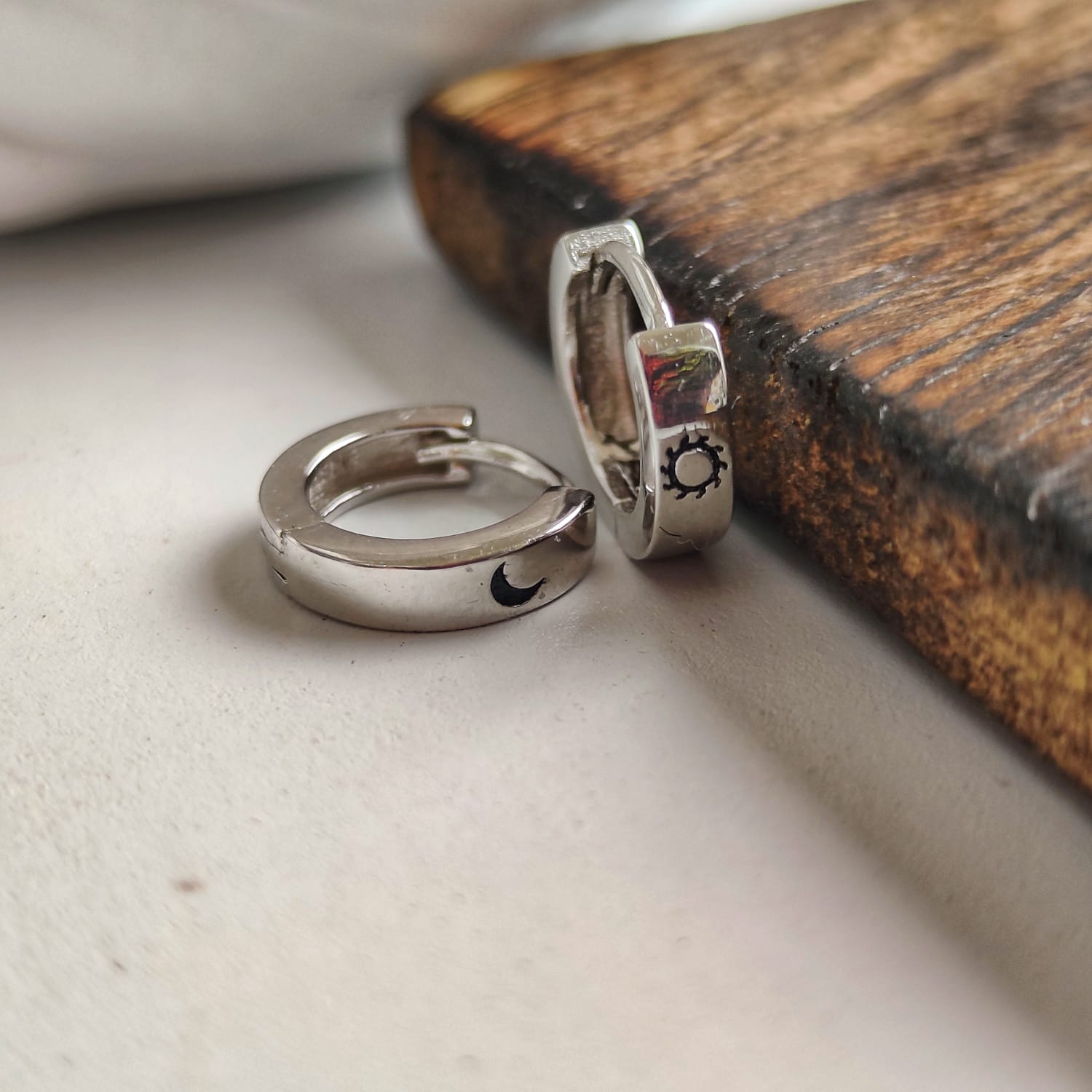 A pair of 925 silver slim hoop earrings featuring a minimalist sun and moon design, perfect for unisex wear.