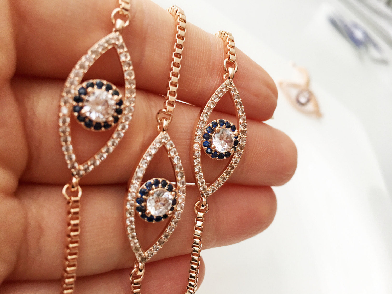 Pair this bracelet with other gold or rose gold jewelry for a cohesive look. It can be worn alone for a minimalist style or stacked with other bracelets for a bolder statement. The evil eye bracelet complements both casual and formal outfits, making it a versatile addition to your jewelry collection.