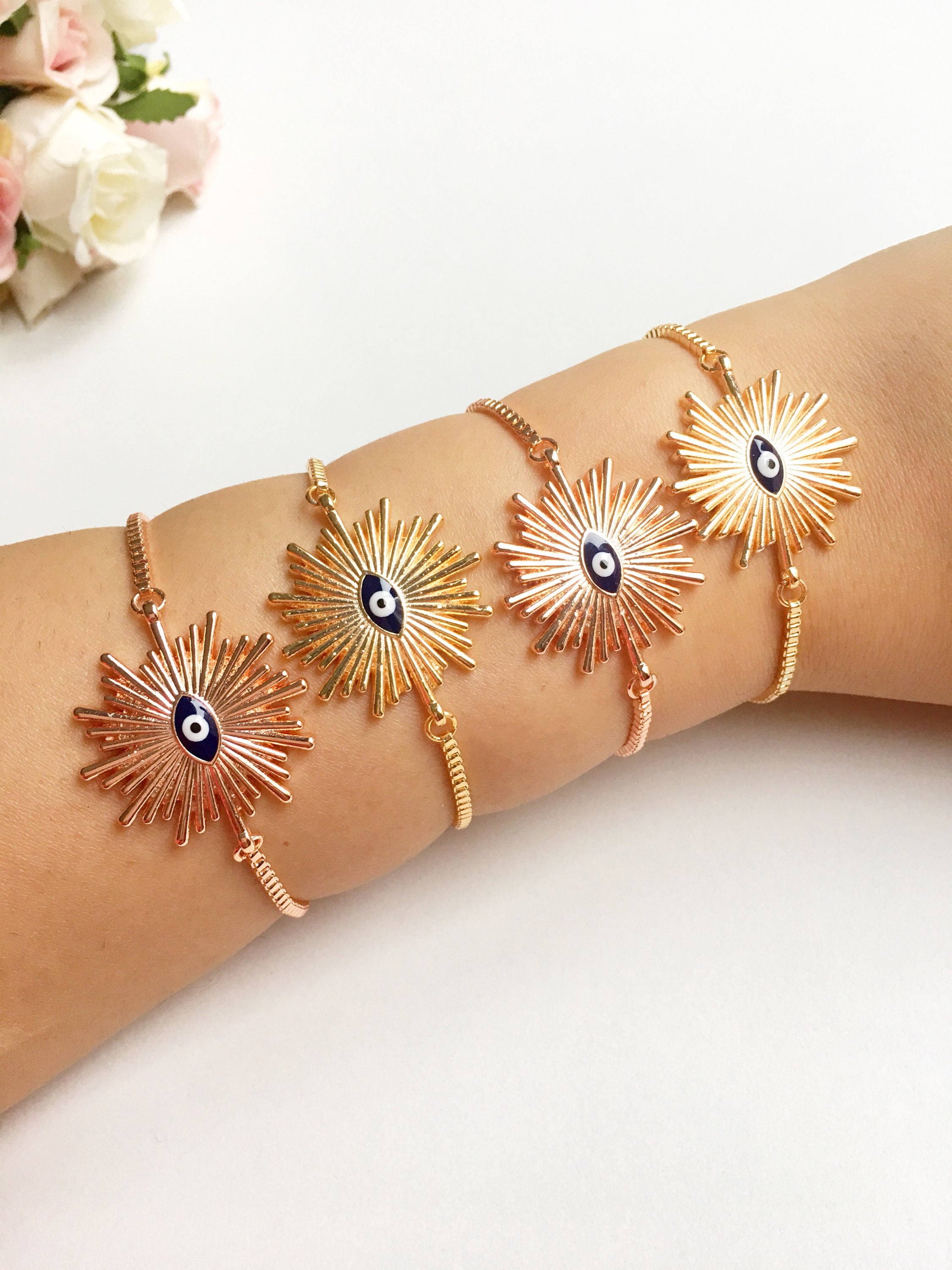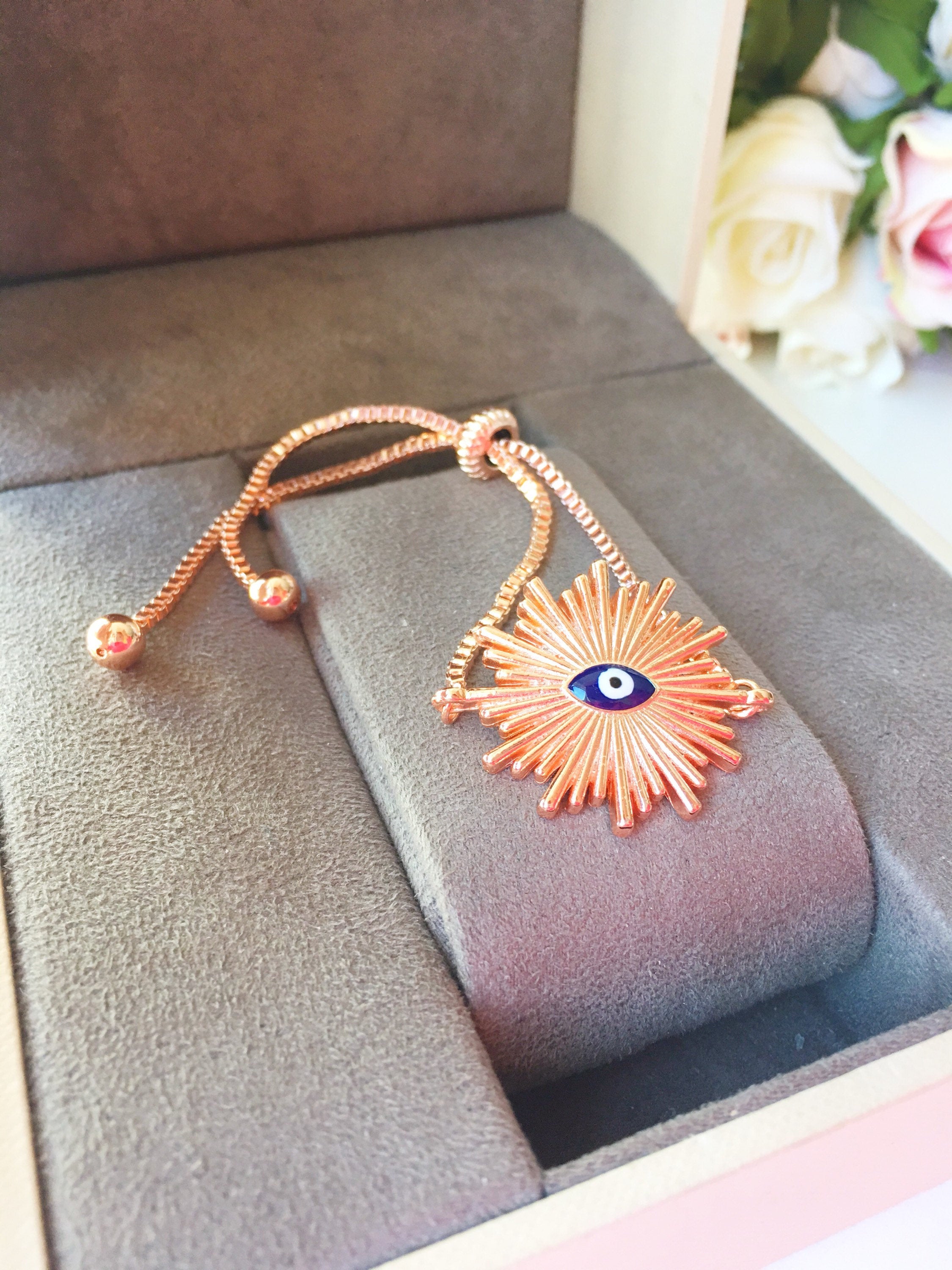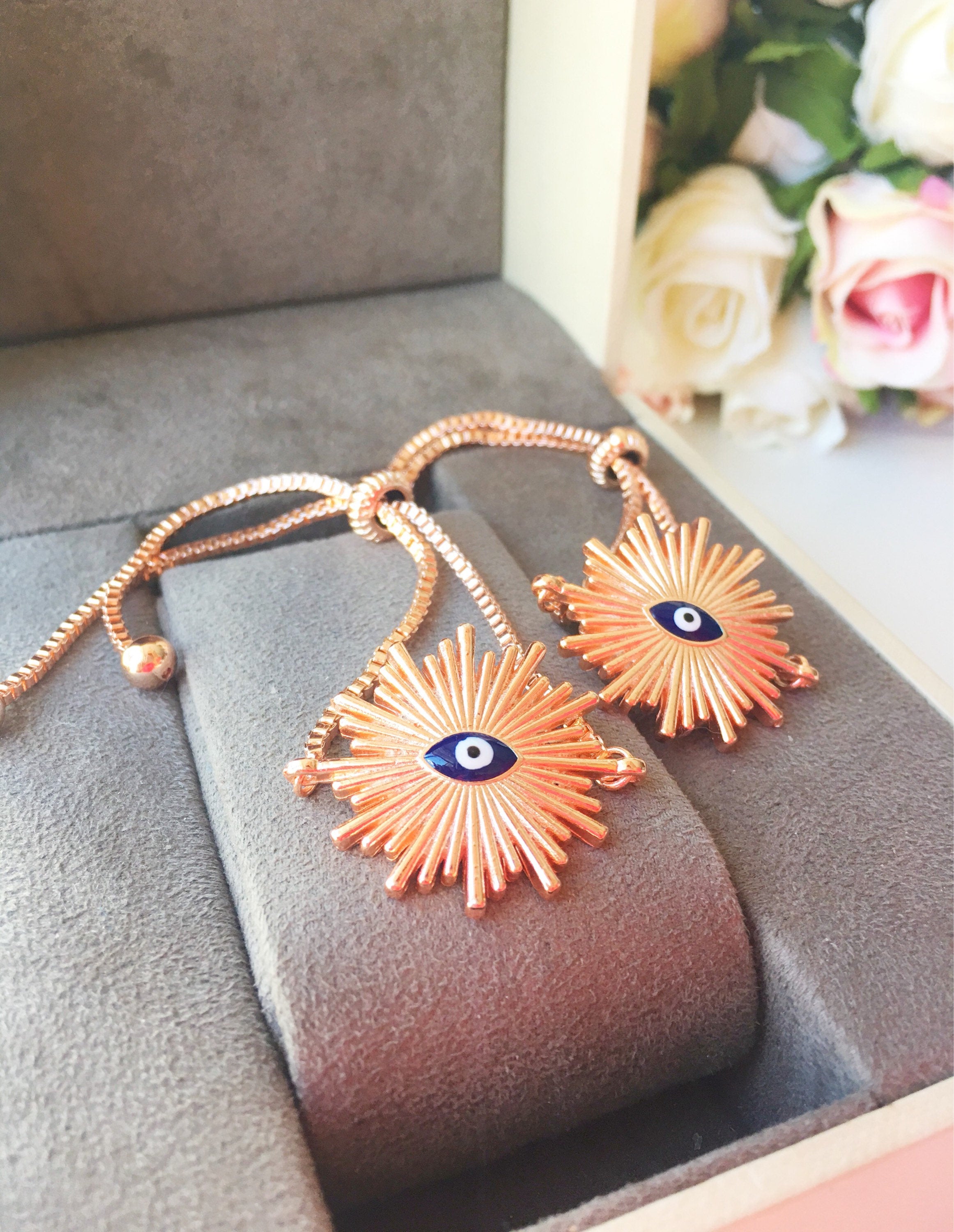 In summary, the Adjustable Sunny Evil Eye Charm Bracelet in rose gold is more than just a beautiful accessory; it is a symbol of protection and good fortune. With its durable materials, adjustable design, and stylish appearance, it is a must-have addition to any jewelry collection. Whether you are treating yourself or gifting it to someone special, this bracelet is sure to impress.