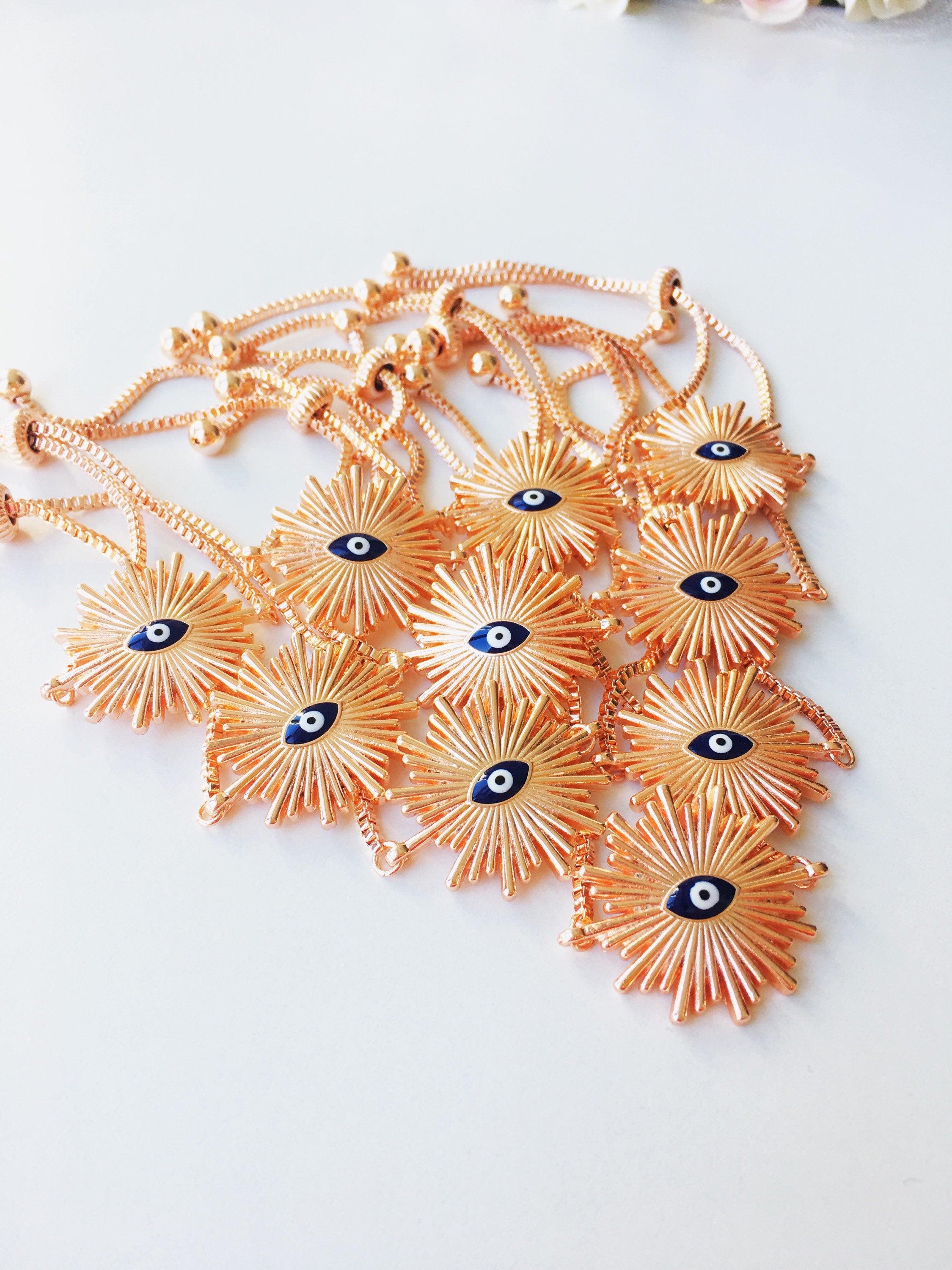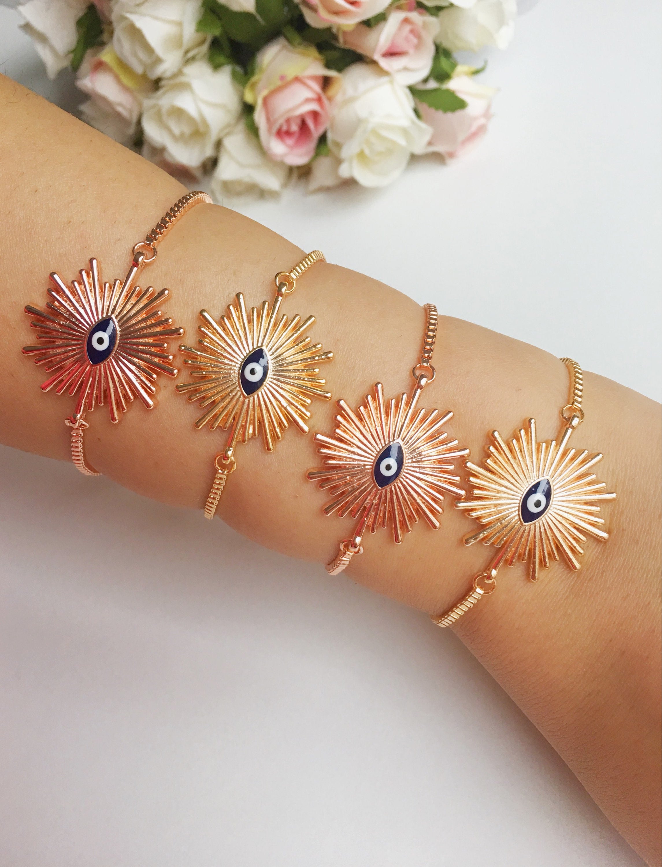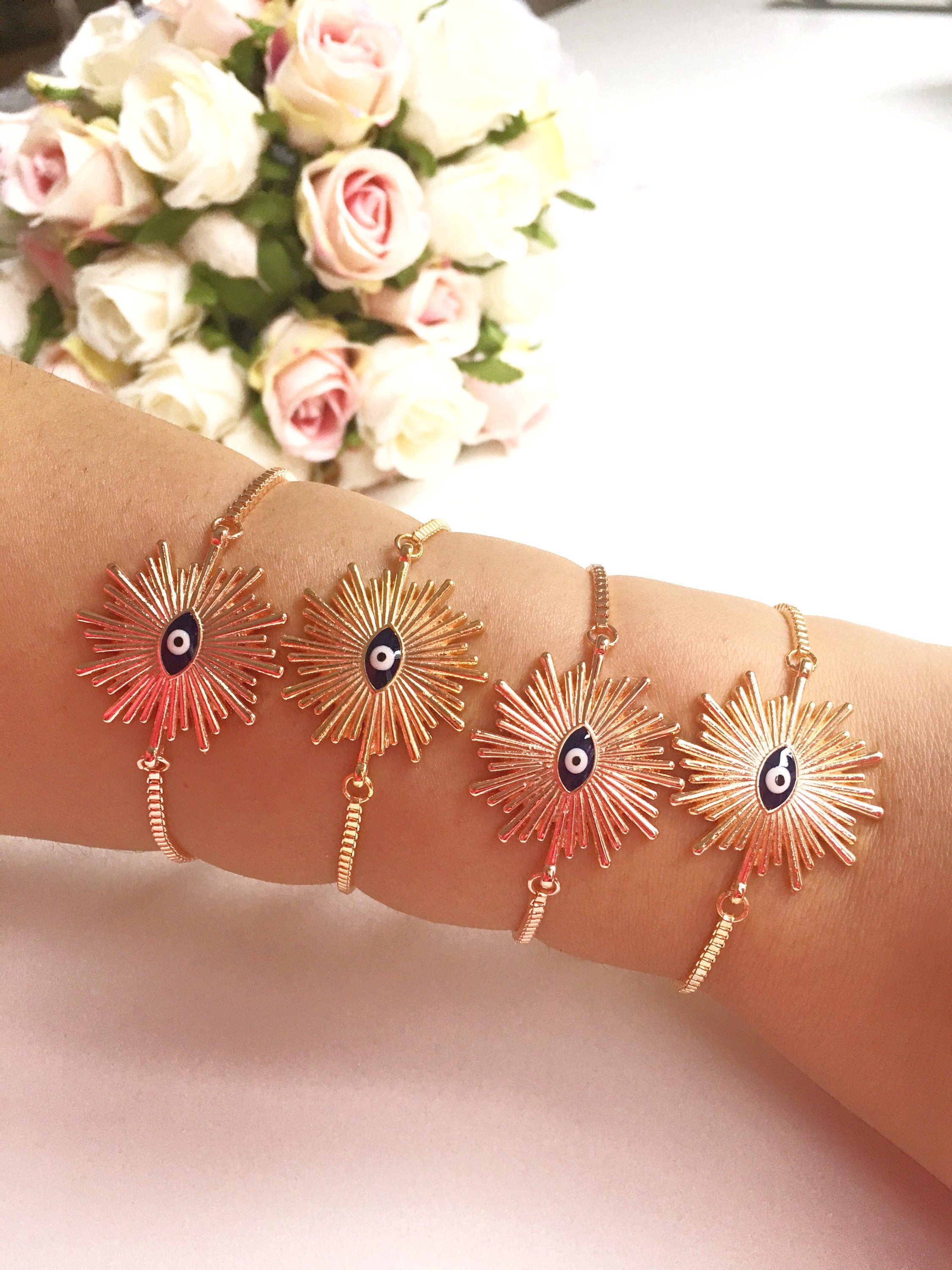 In summary, the Adjustable Sunny Evil Eye Charm Bracelet in rose gold is more than just a beautiful accessory; it is a symbol of protection and good fortune. With its durable materials, adjustable design, and stylish appearance, it is a must-have addition to any jewelry collection. Whether you are treating yourself or gifting it to someone special, this bracelet is sure to impress.