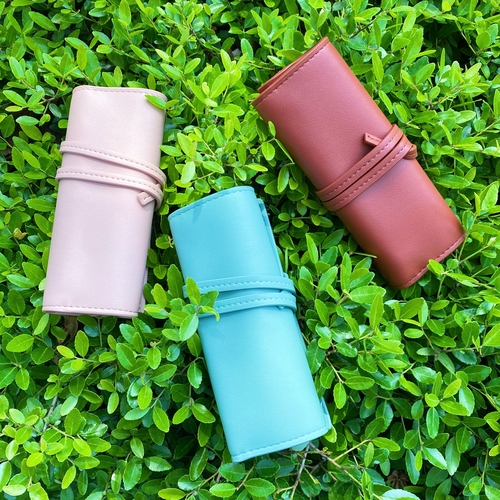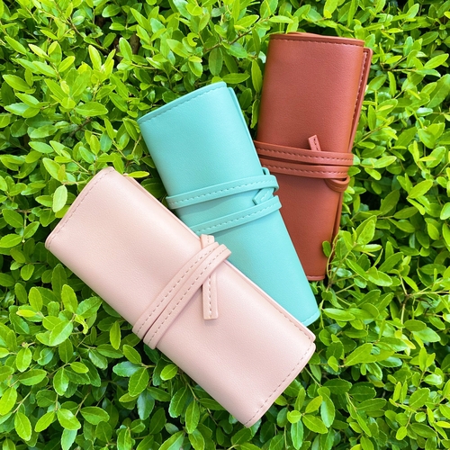 Always With Me Jewelry Roll in three colors, made from vegan leather, showcasing its stylish and compact design.