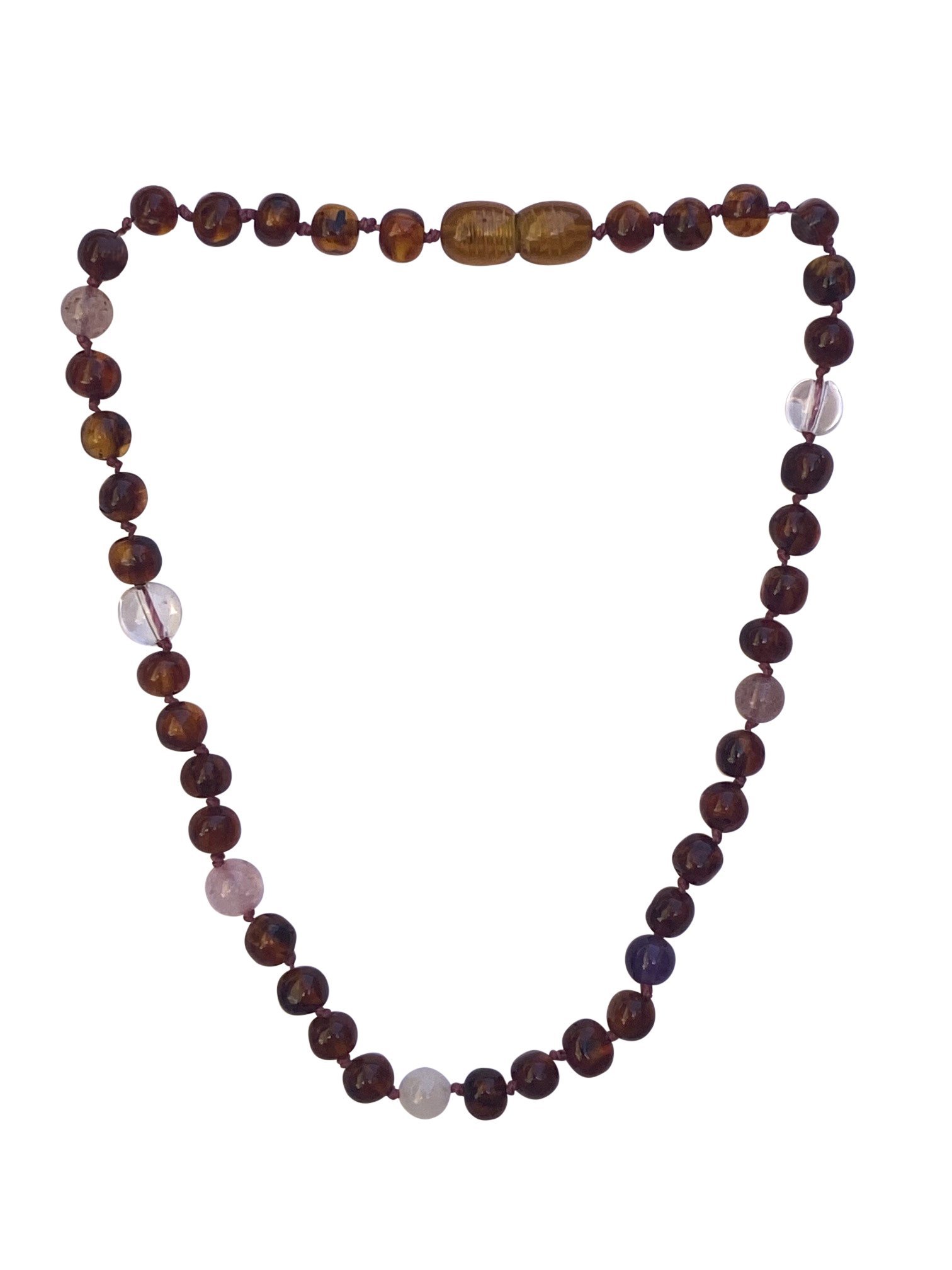 Amber and pink/purple gemstone baby necklace with polished beads and secure clasp, designed for teething relief.