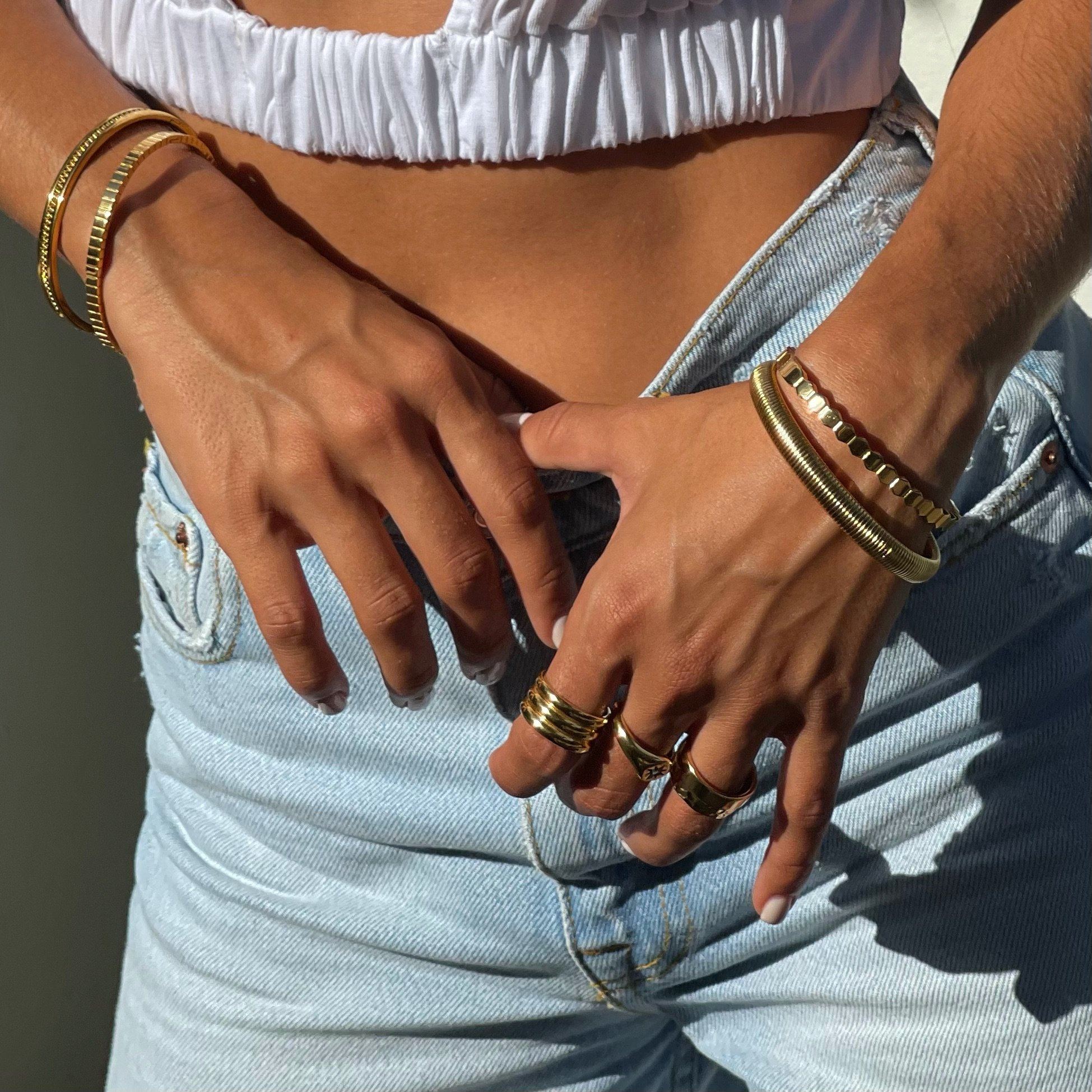 The Ashton Band Ring is a stunning piece of jewelry that combines elegance and durability. Crafted from high-quality stainless steel and plated with 18k gold, this ring is designed to withstand the test of time while maintaining its beautiful appearance. Whether you're dressing up for a special occasion or looking for a stylish accessory for everyday wear, the Ashton Band Ring is the perfect choice.