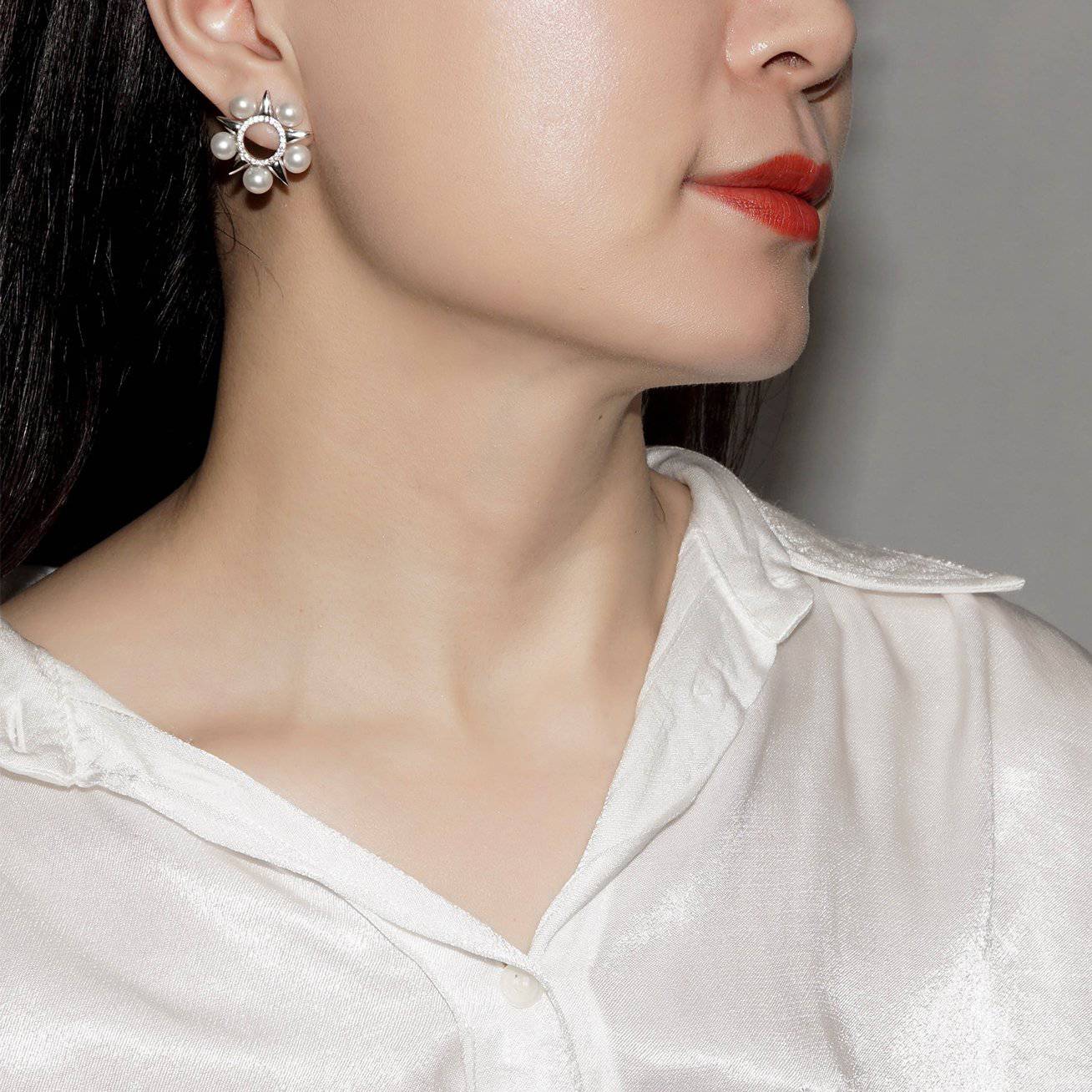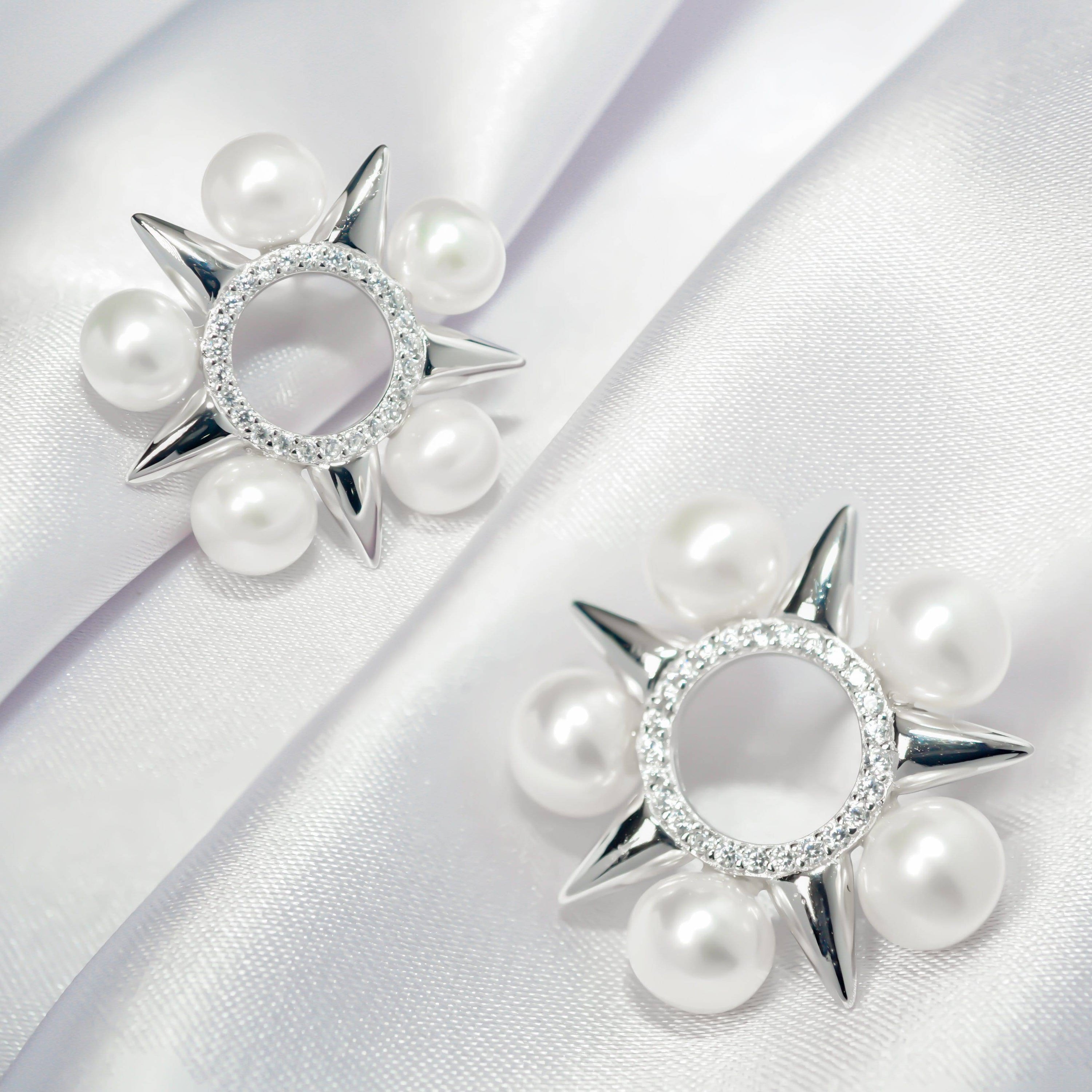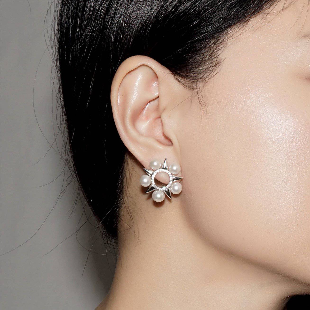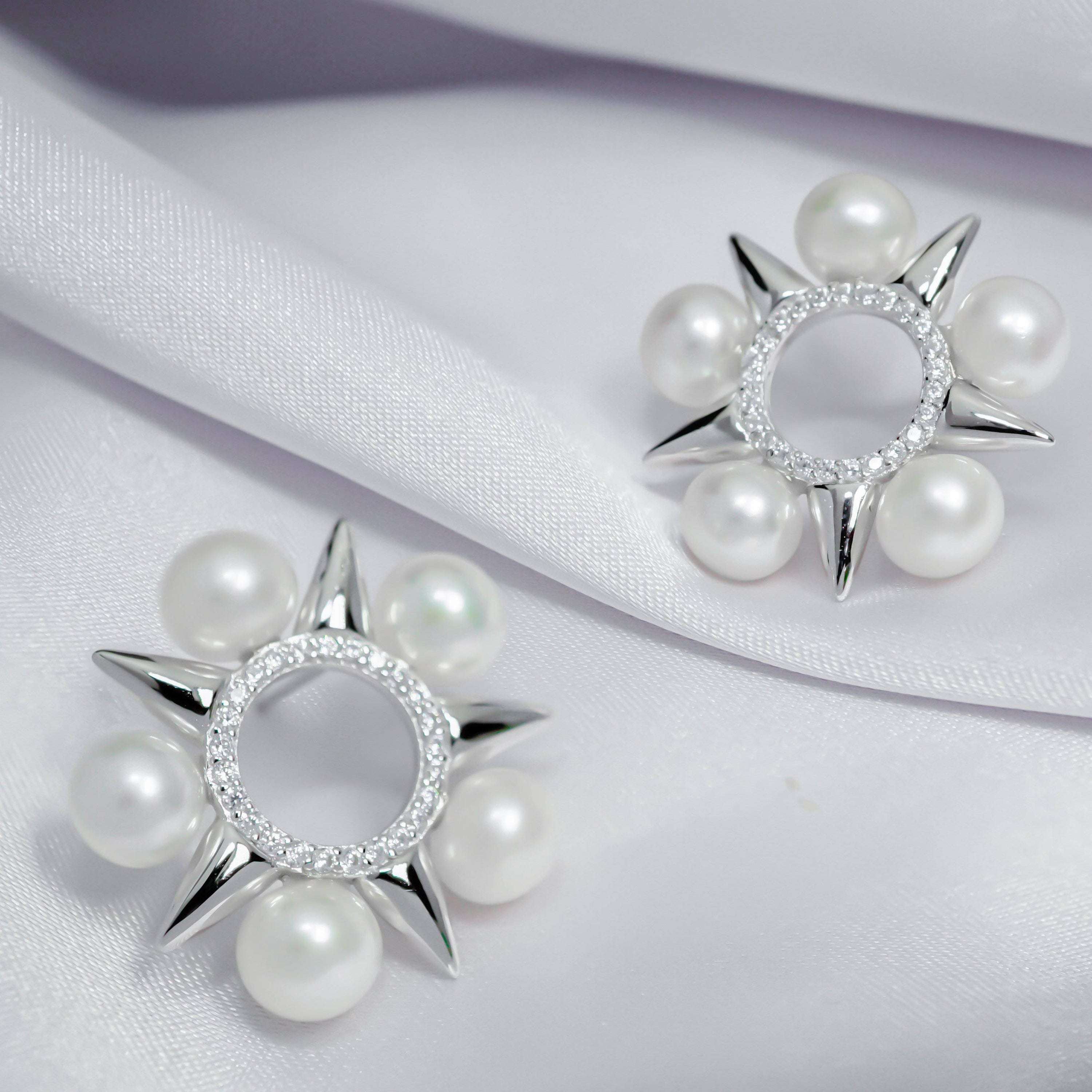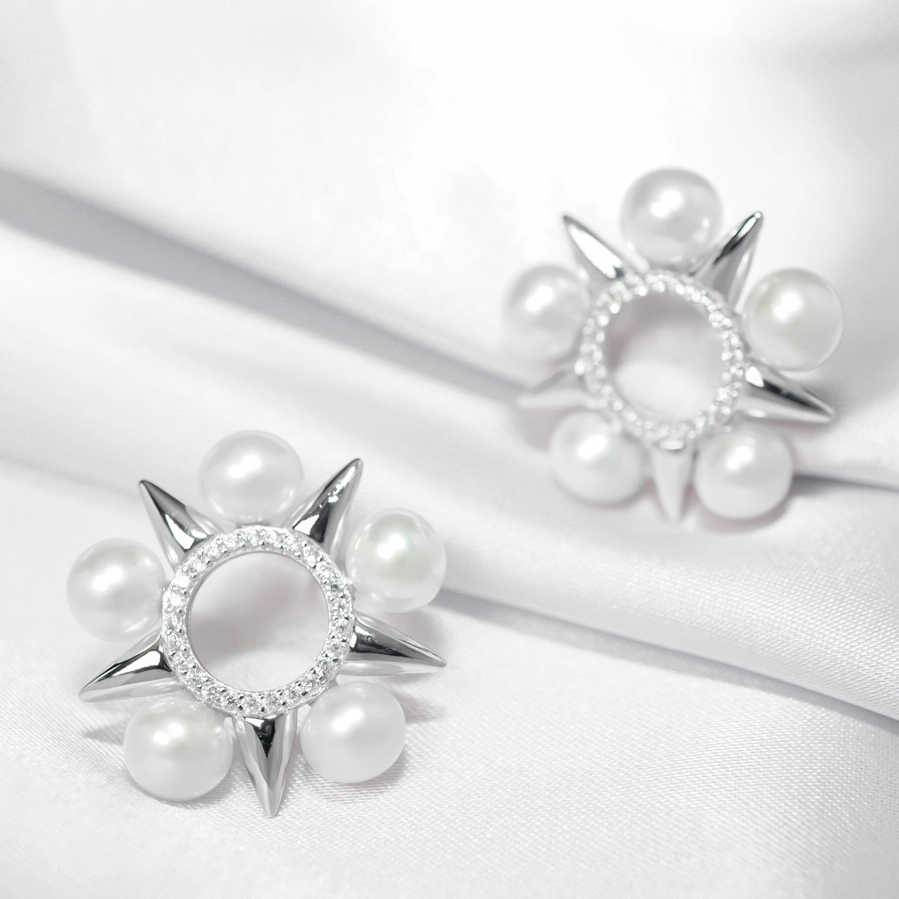 Each pair of earrings is expertly crafted from high-quality sterling silver, ensuring durability and a luxurious feel. The earrings are adorned with five lustrous freshwater pearls, each measuring 4-5mm in diameter. The surface grading of these pearls is rated as B, while their lustre grading is excellent, making them a standout feature of the earrings.