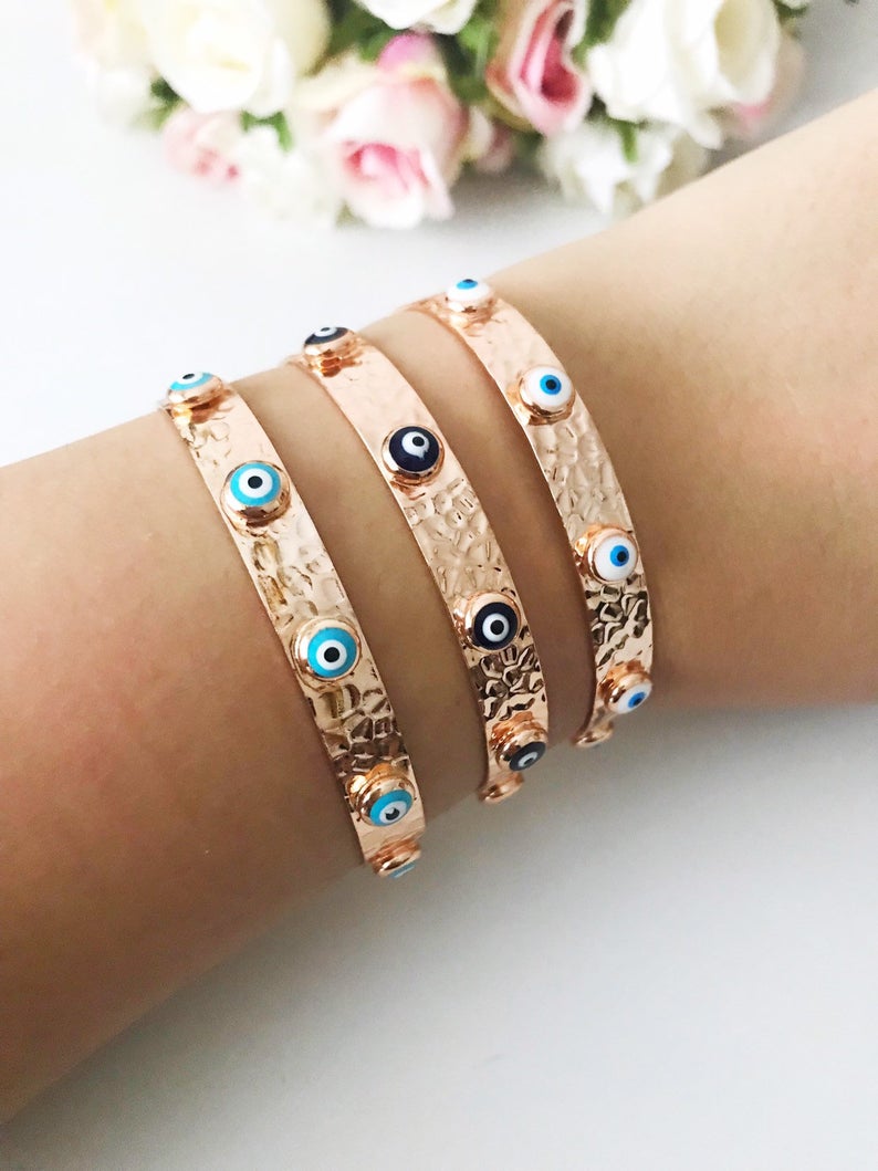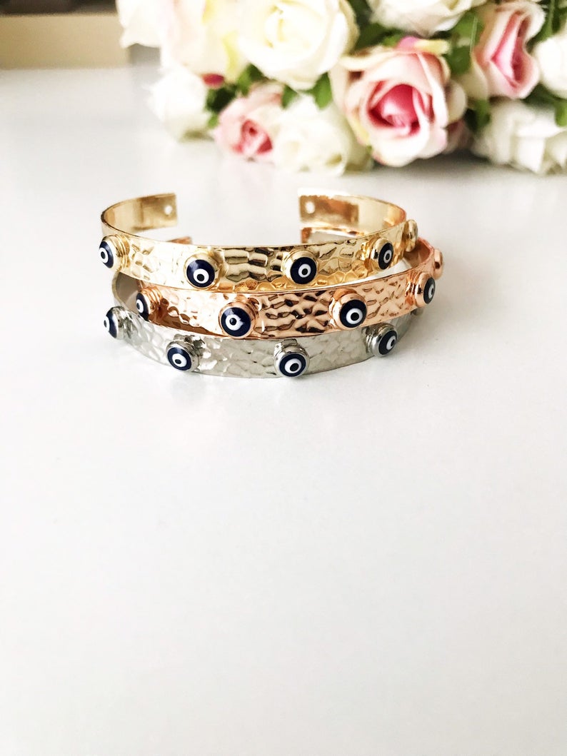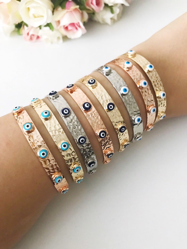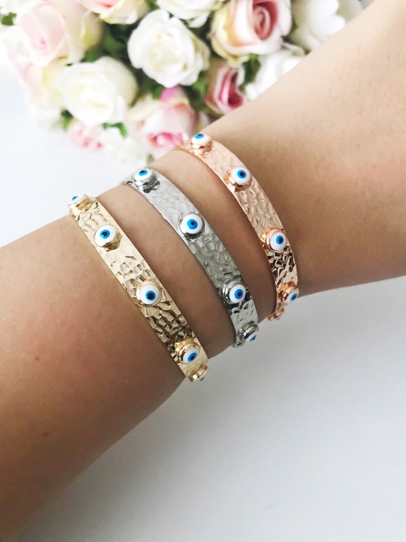 The Evil Eye Bangle Bracelet is available in three stunning finishes: rose gold, gold, and silver. Each finish offers a distinct look, allowing you to choose the one that best complements your personal style. Whether you prefer the warm tones of rose gold or the classic elegance of silver, this bracelet is sure to make a statement.