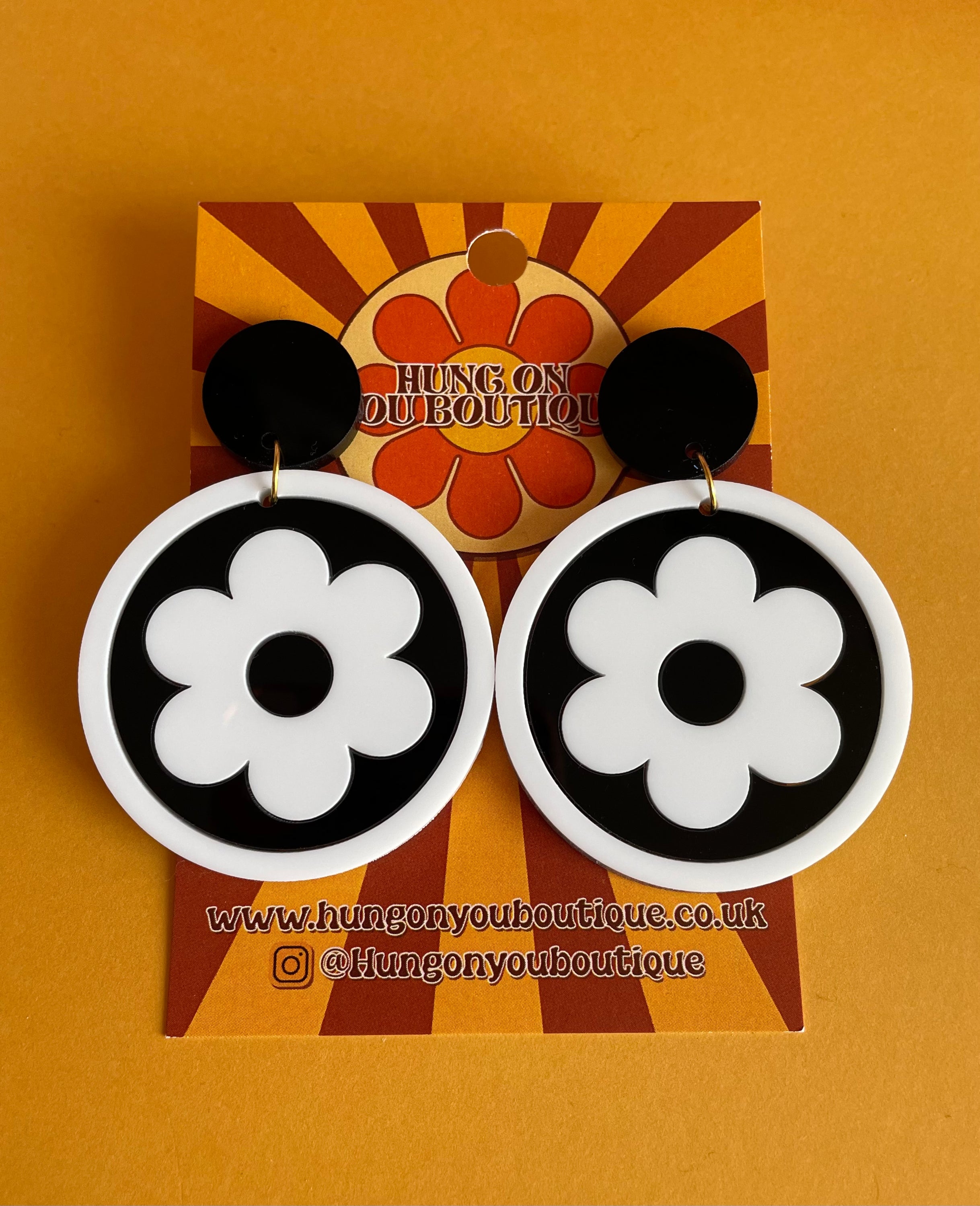 Stylish Bazaar Earrings featuring laser-cut acrylic design, inspired by 1960s fashion, available in clip-on style.
