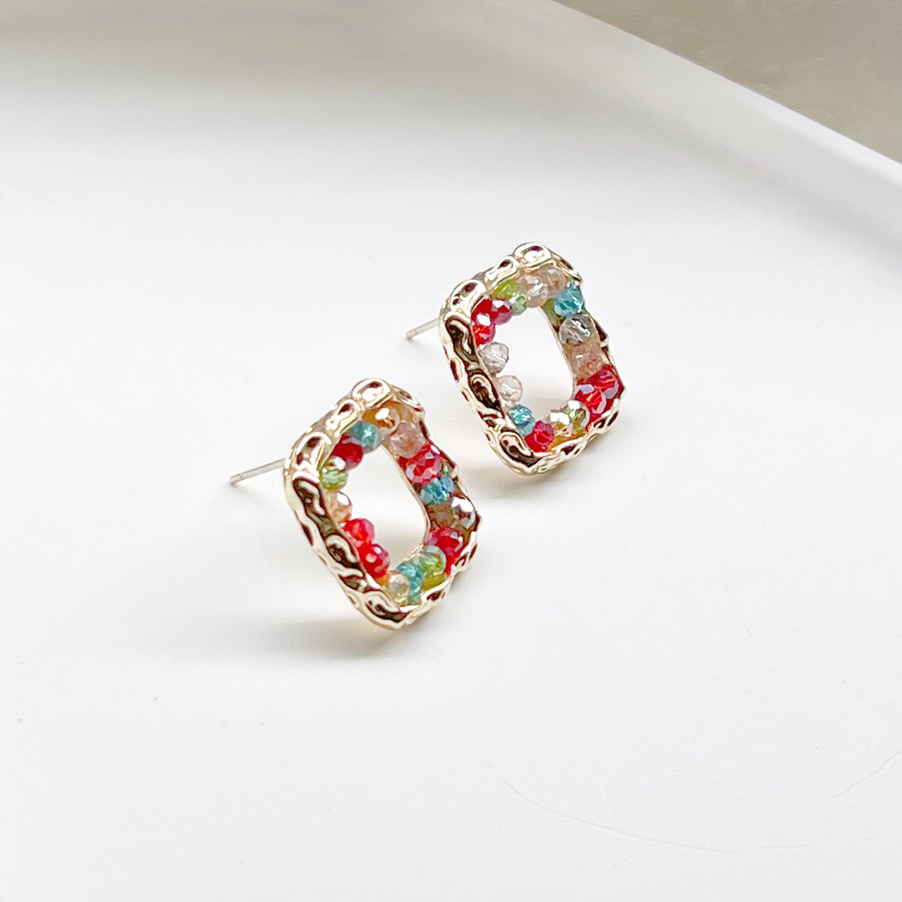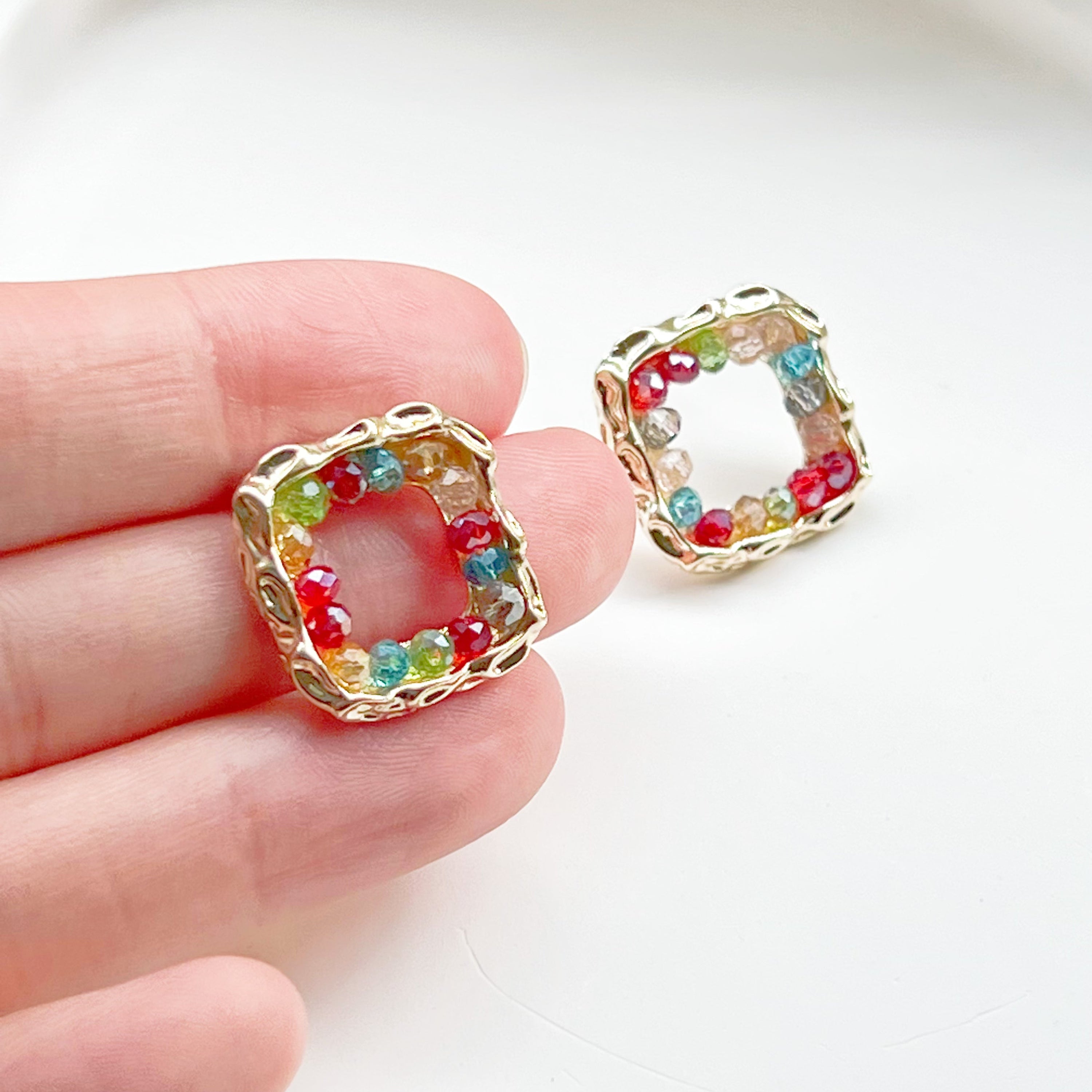 Each pair of earrings is handmade, ensuring that the placement of the rainbow beads is unique to every piece. This artisanal touch adds a personal flair, making them not just earrings, but a piece of art that reflects your individuality. The square hoop design is modern and trendy, perfect for fashion-forward individuals who want to stand out.