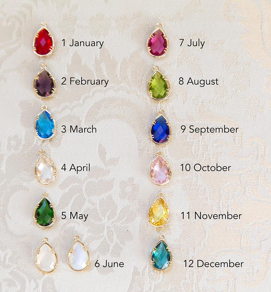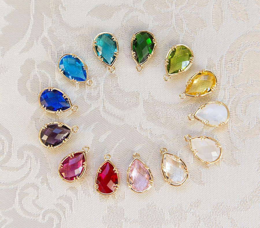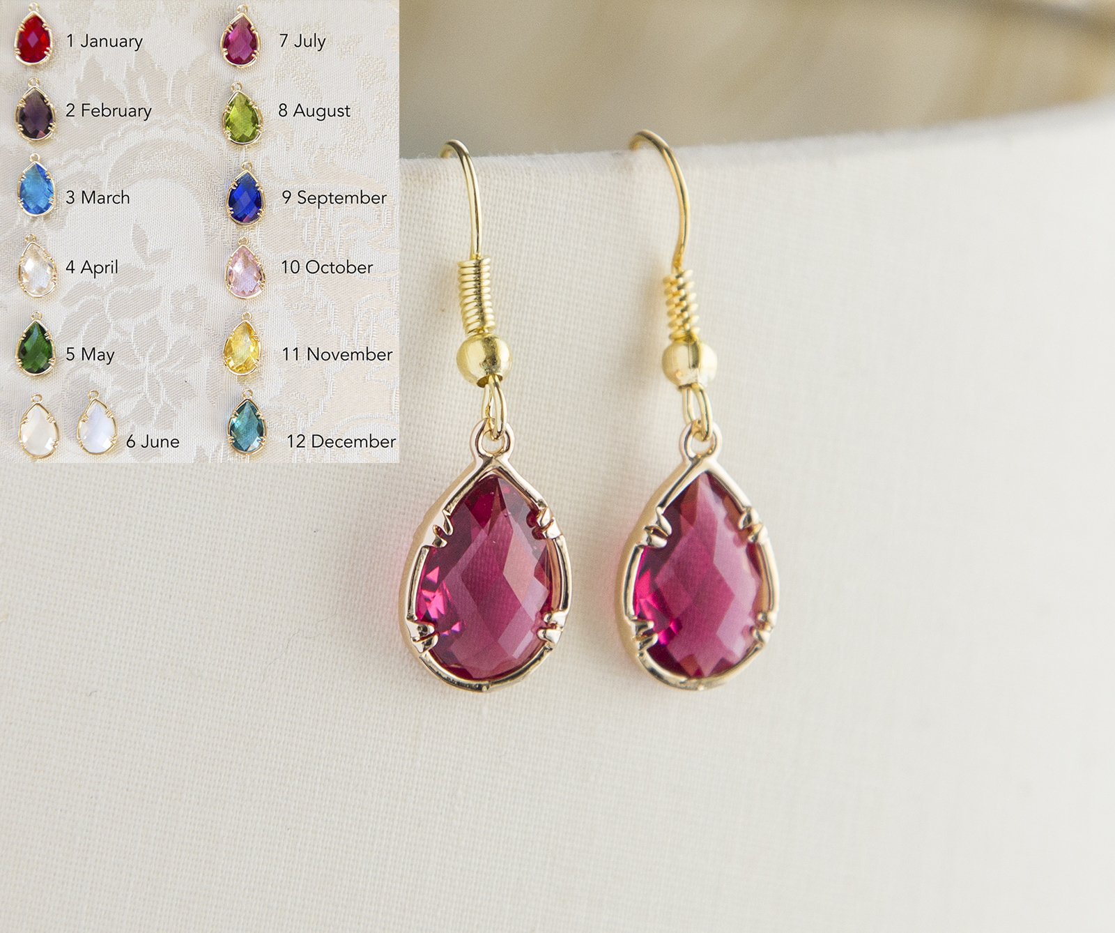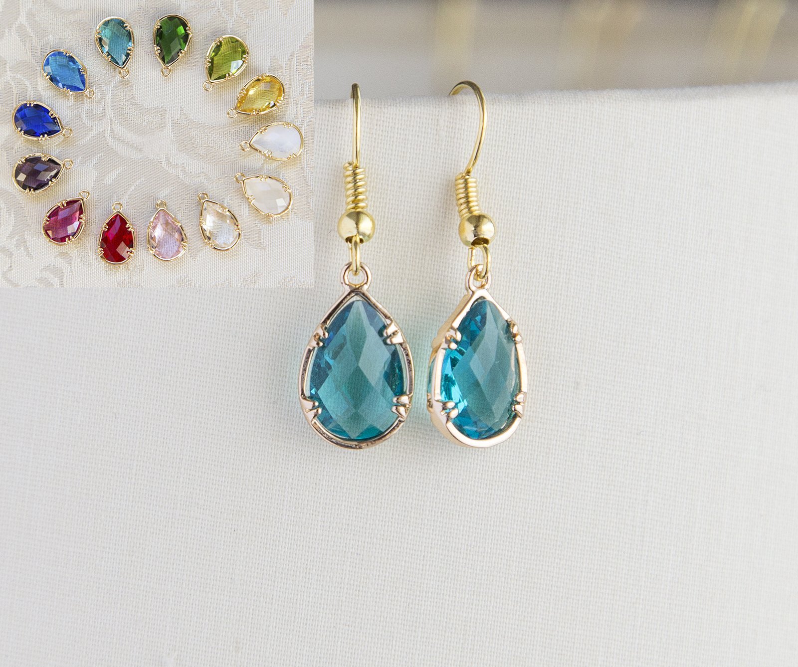 A pair of elegant gold plated earrings featuring faceted teardrop glass in various birthstone colors, showcasing their delicate design.