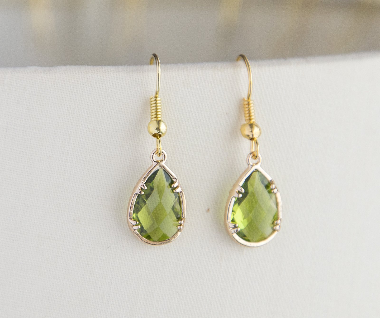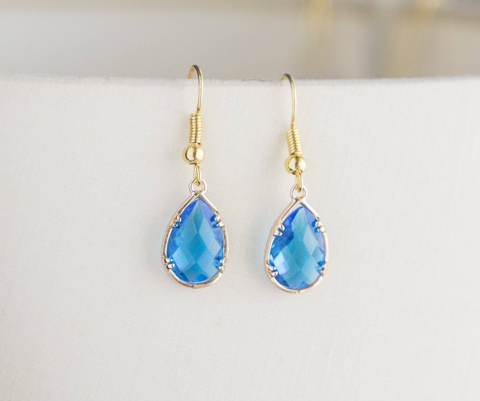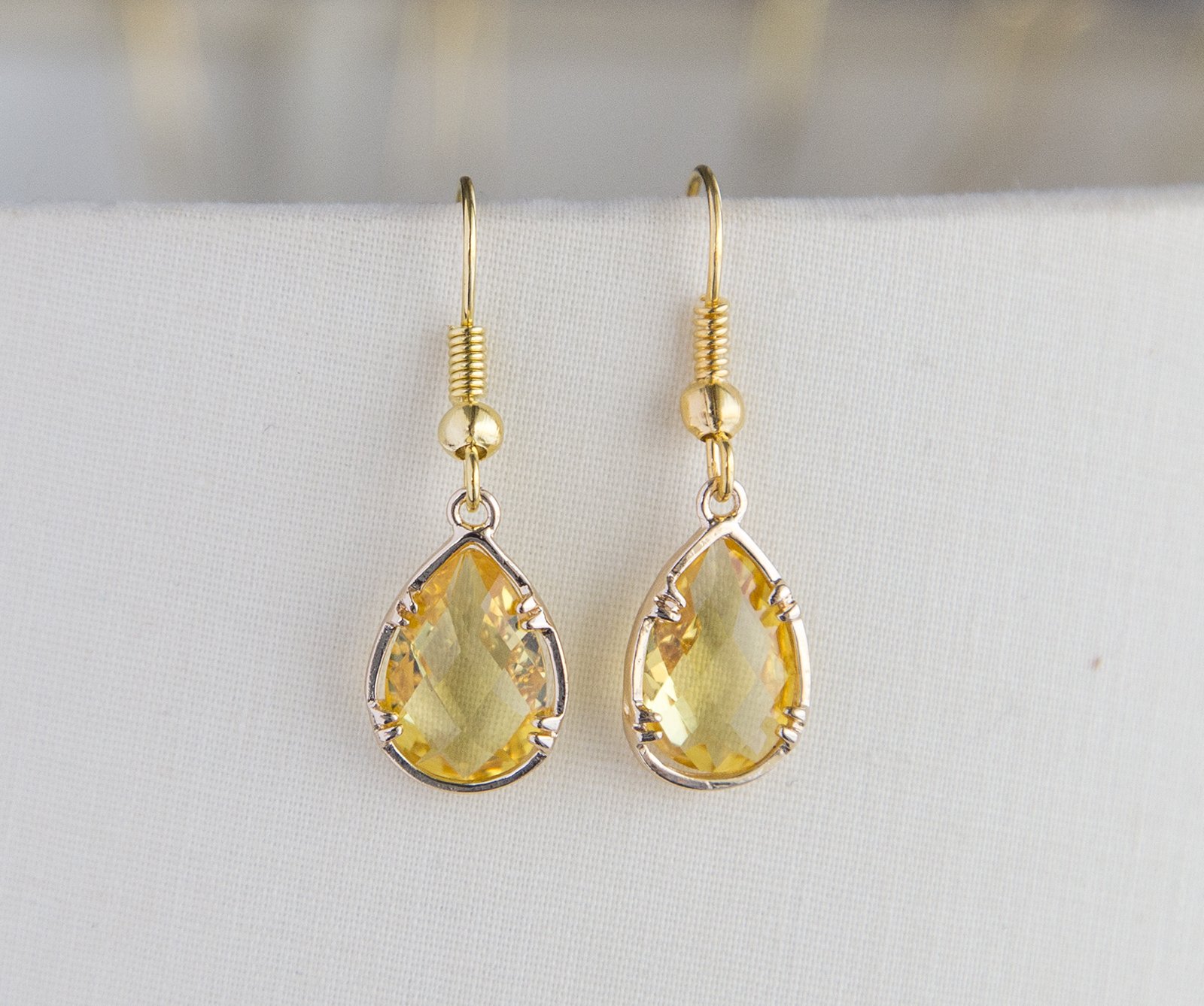 A pair of elegant gold plated earrings featuring faceted teardrop glass in various birthstone colors, showcasing their delicate design.