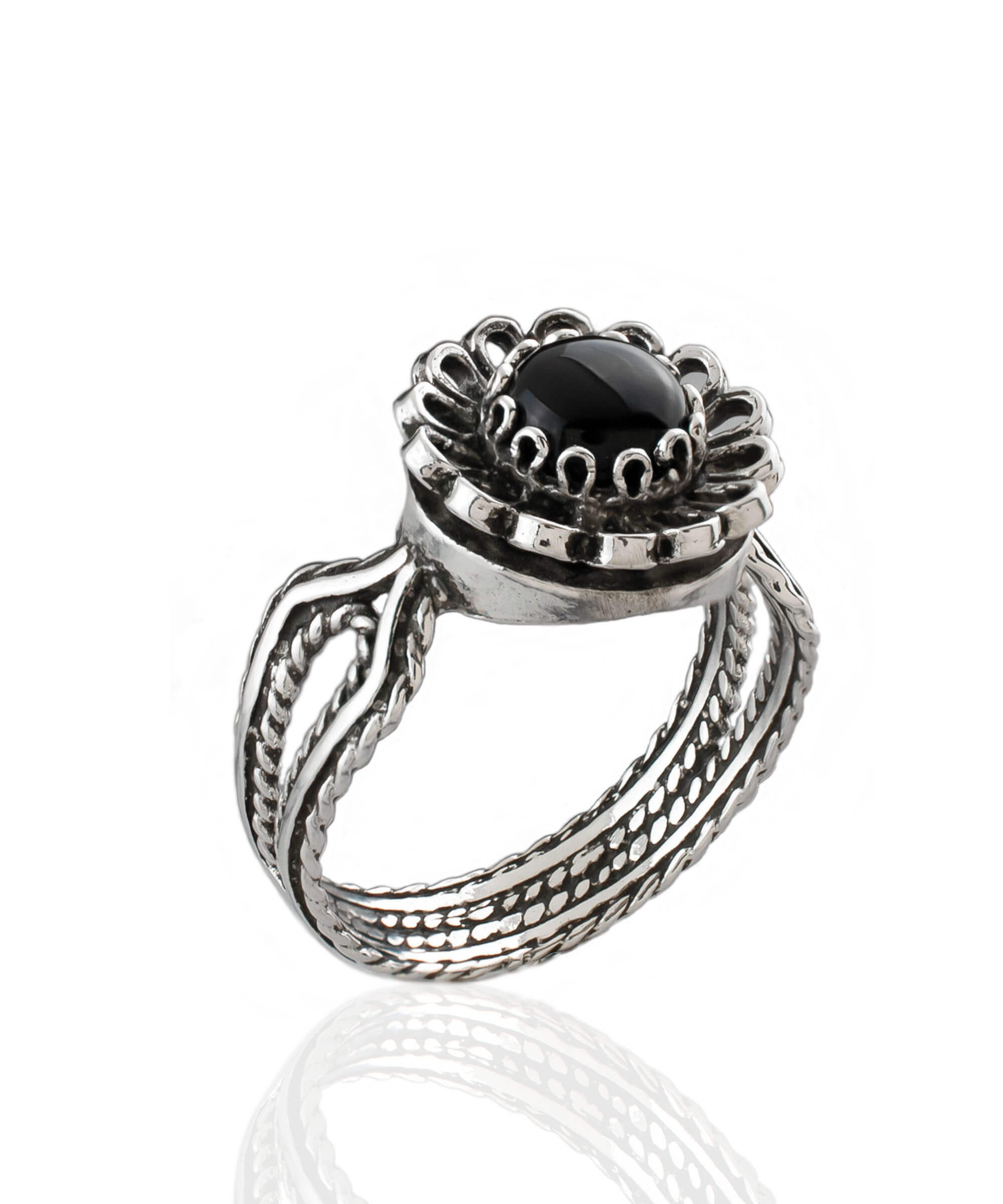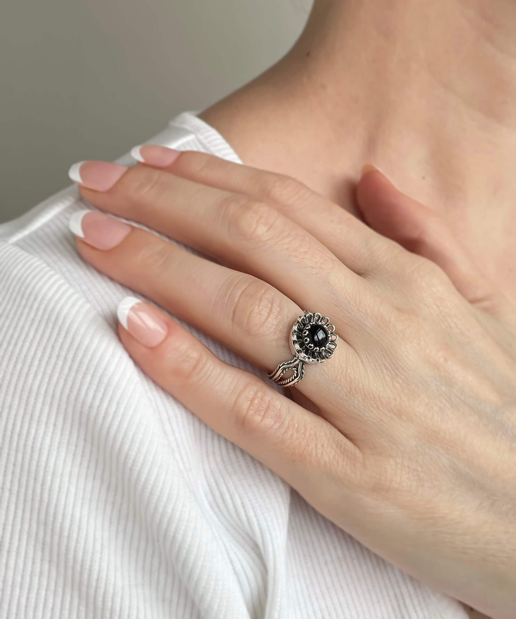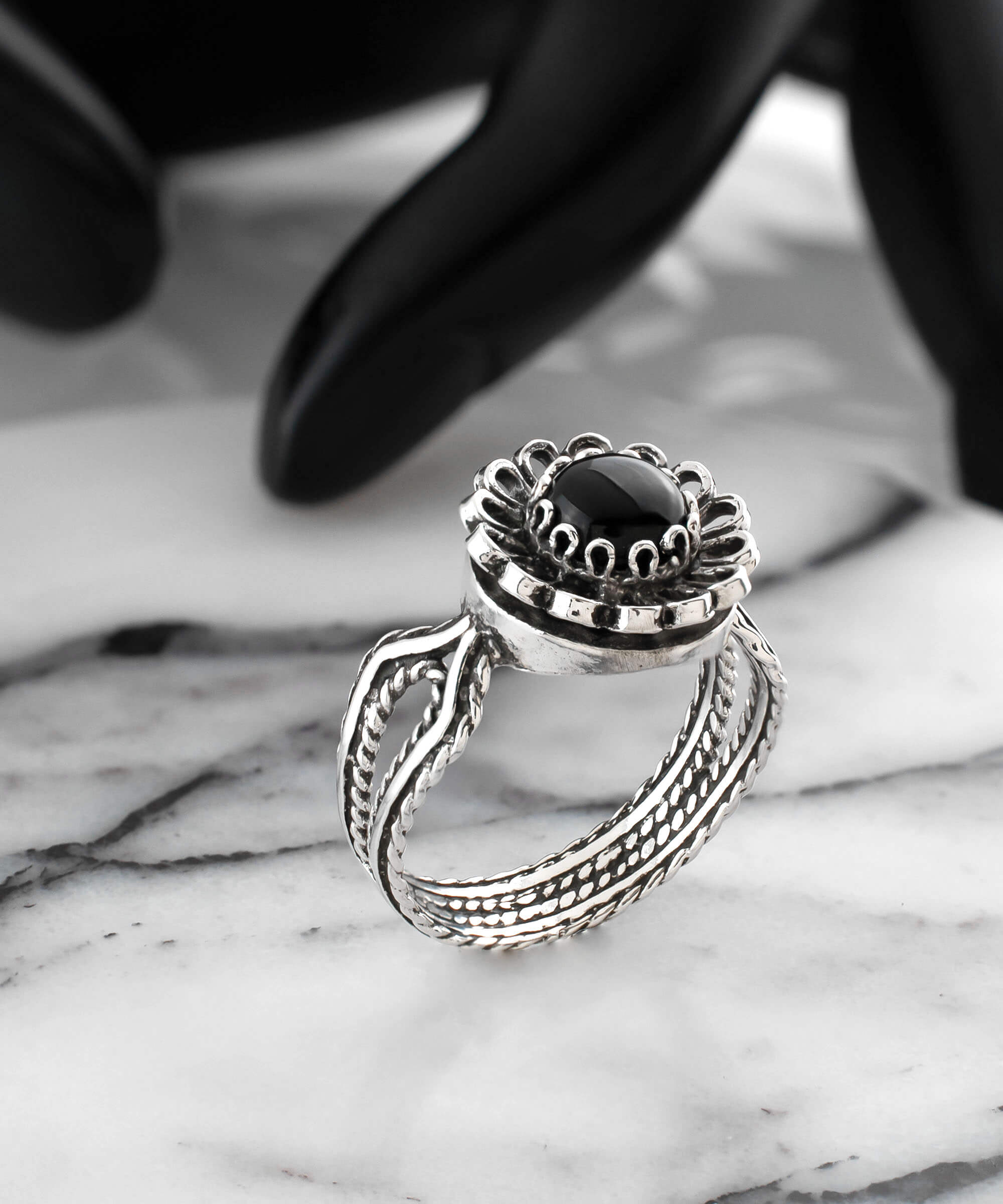 The intricate lace dainty flower design of this cocktail ring showcases the exceptional craftsmanship that goes into each piece. The filigree art is a testament to the skill and artistry of the jeweler, making this ring not just an accessory but a work of art. The oxidized and highly polished finish enhances the beauty of the black onyx, ensuring that it catches the light beautifully.
