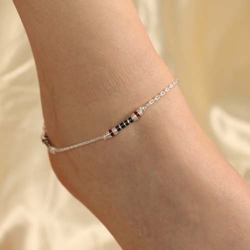 The anklet is crafted with finesse, showcasing a delicate chain of sterling silver that is both durable and lightweight. The vibrant black and red enamel pipe beads add a pop of color, capturing the essence of summer and the spirit of bohemian fashion. Each bead is carefully selected to ensure that the anklet not only looks beautiful but also feels comfortable when worn.