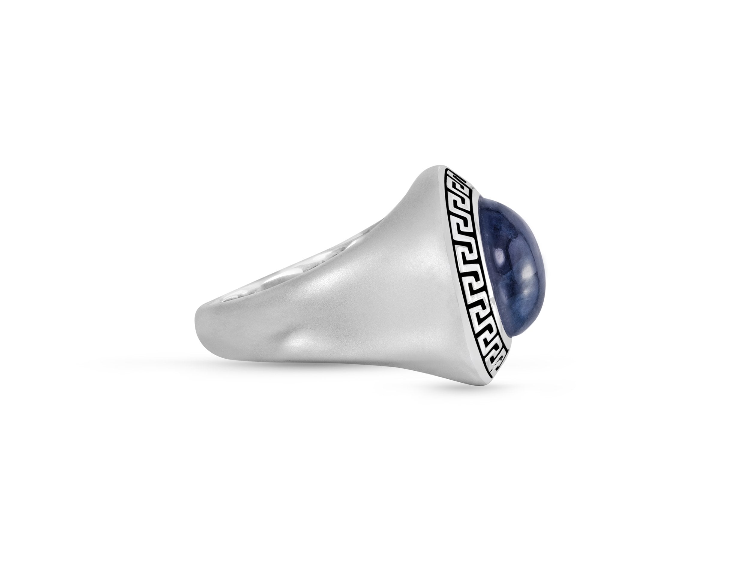 Introducing the exquisite Blue Apatite Stone Signet Ring in Black Rhodium Plated Sterling Silver from the LMJ Origin Collection. This stunning piece is designed for those who appreciate subtle elegance and rich color tones. The captivating blue apatite stone is the centerpiece of this ring, surrounded by intricate Byzantine-inspired symbols that add a touch of sophistication and history to the design.