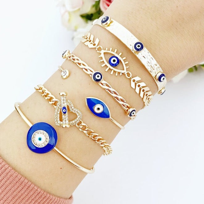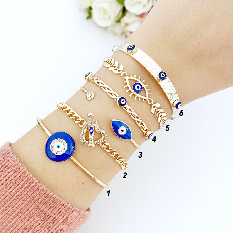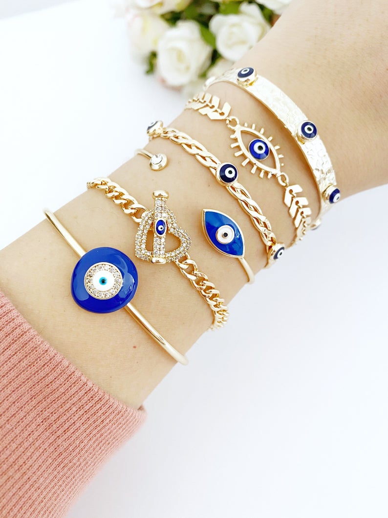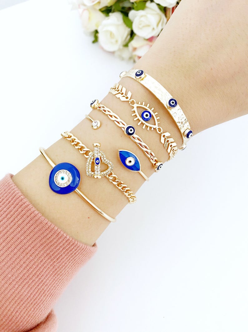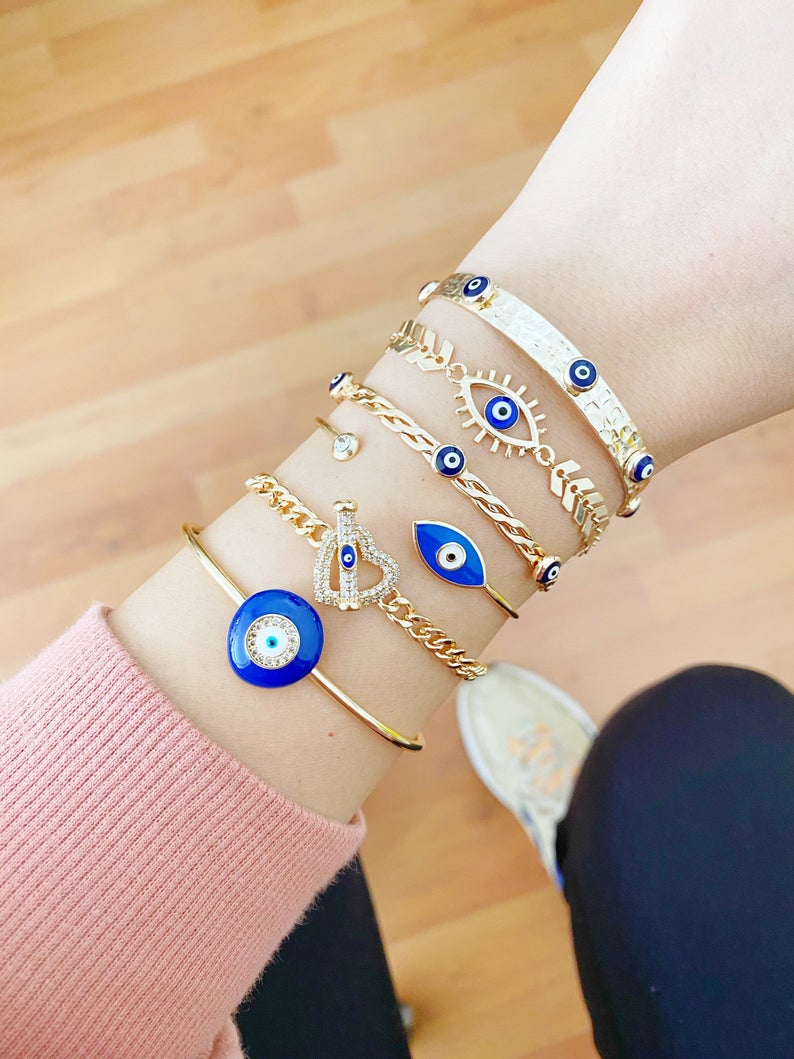 Dropship Blue Evil Eye Bracelet, Bangle Bracelet, Evil Eye Jewelry, Gold Toggle