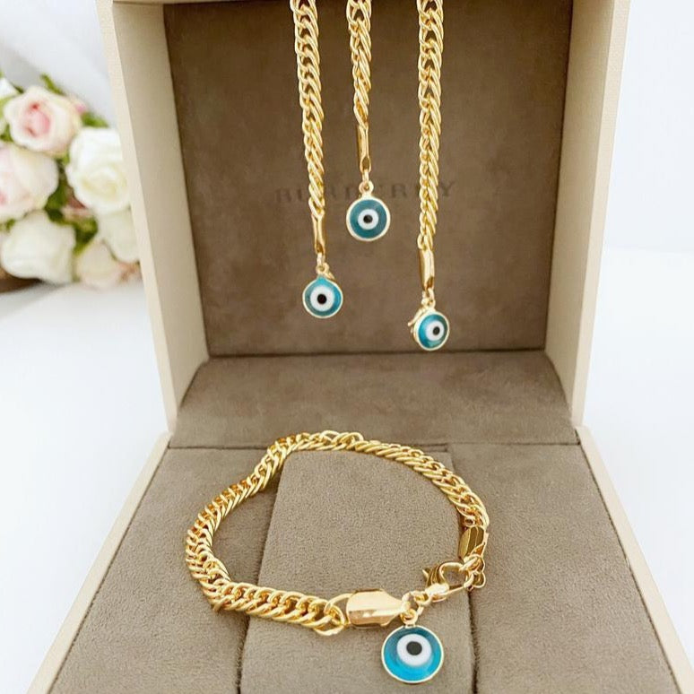 Crafted with care, the Blue Evil Eye Bracelet showcases a chunky gold chain that adds a bold statement to your wrist. The combination of the blue beads and the gold chain creates a striking contrast that is both eye-catching and elegant. Each bracelet is handmade, ensuring that every piece is unique and of the highest quality. The attention to detail in the craftsmanship makes this bracelet not just a piece of jewelry, but a work of art.