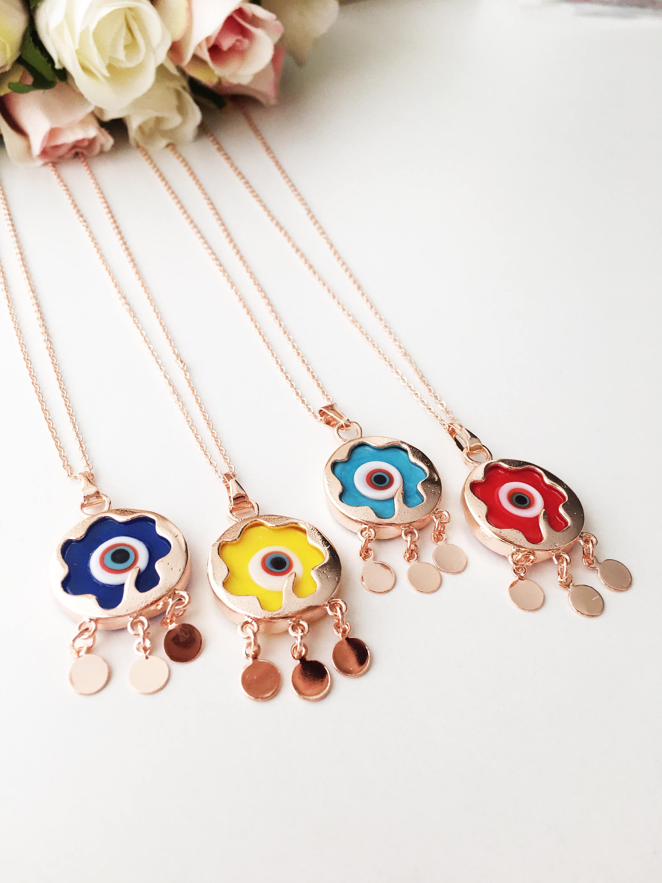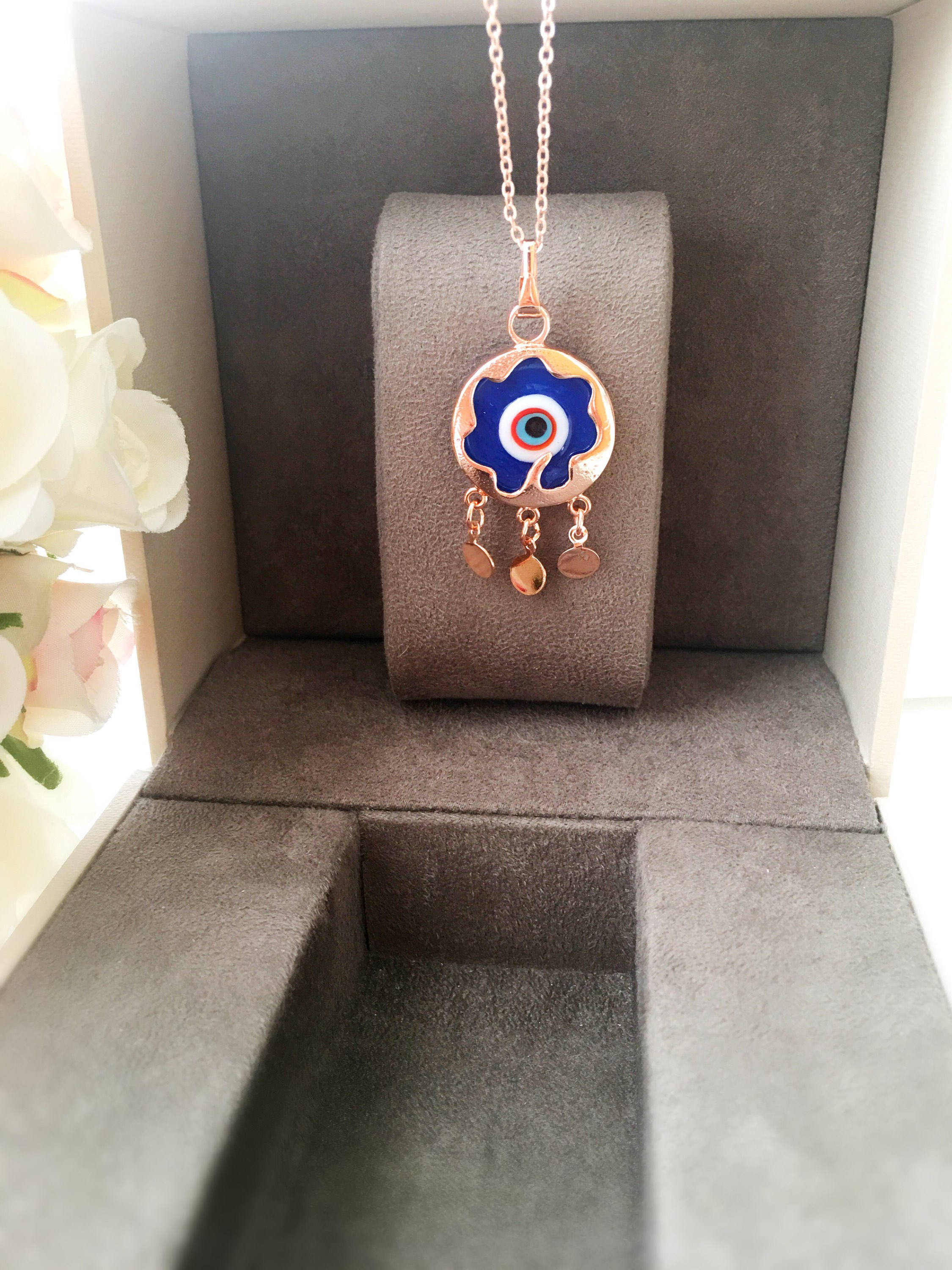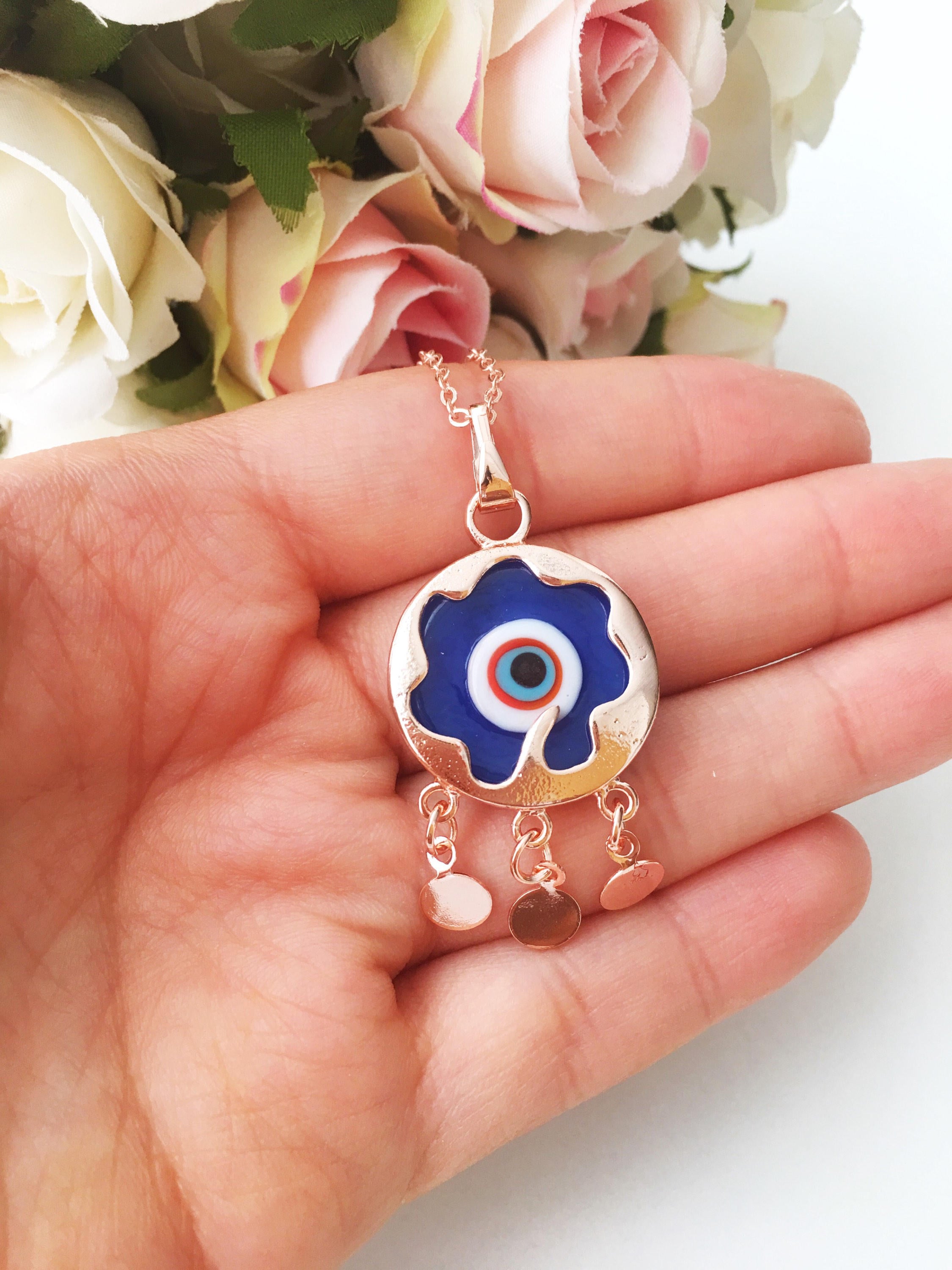 This Turkish eye necklace is not only beautiful but also versatile. It can be worn with a variety of outfits, from casual to formal. Pair it with a simple blouse for a chic everyday look or wear it with a dress for a more elegant appearance. The striking blue color and rose gold accents make it a standout piece that can elevate any outfit.