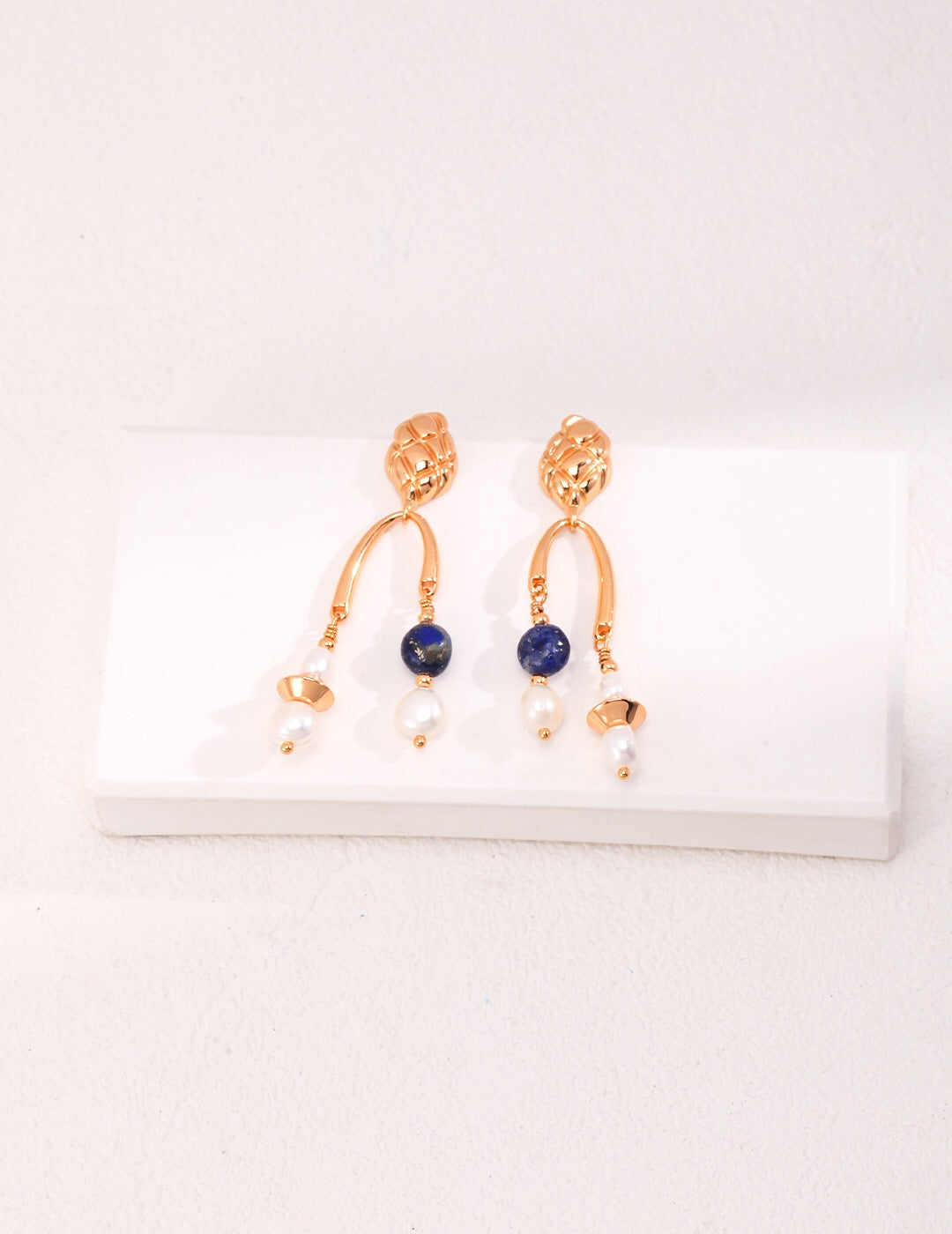 Our earrings are made from genuine freshwater pearls, known for their perfect luster and unique shapes. Each pearl is carefully selected to ensure it meets our high standards of quality. The earrings are also adorned with beautiful lapis lazuli stones, which add a touch of elegance and sophistication. The materials used include gold vermeil, which is 18ct gold plated on sterling silver, providing a luxurious finish that is both durable and tarnish-resistant.