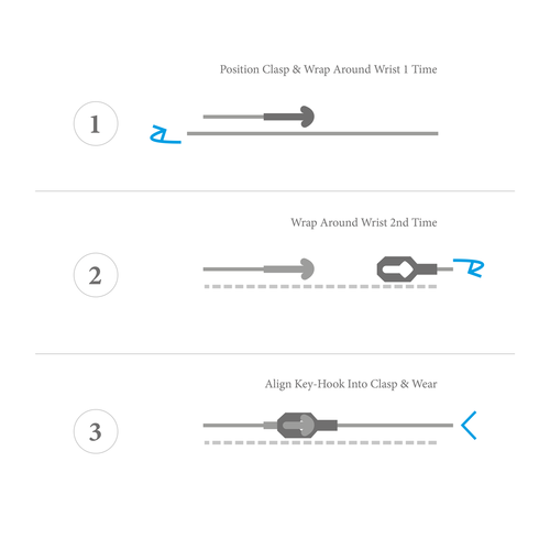 This bracelet is available in four bracelet lengths, 17cm, 19cm, 21cm or 23cm in circumference. To take the bracelet on or off your wrist, simply double wrap the bracelet, then align the key-hook with the hole within the clasp and secure.