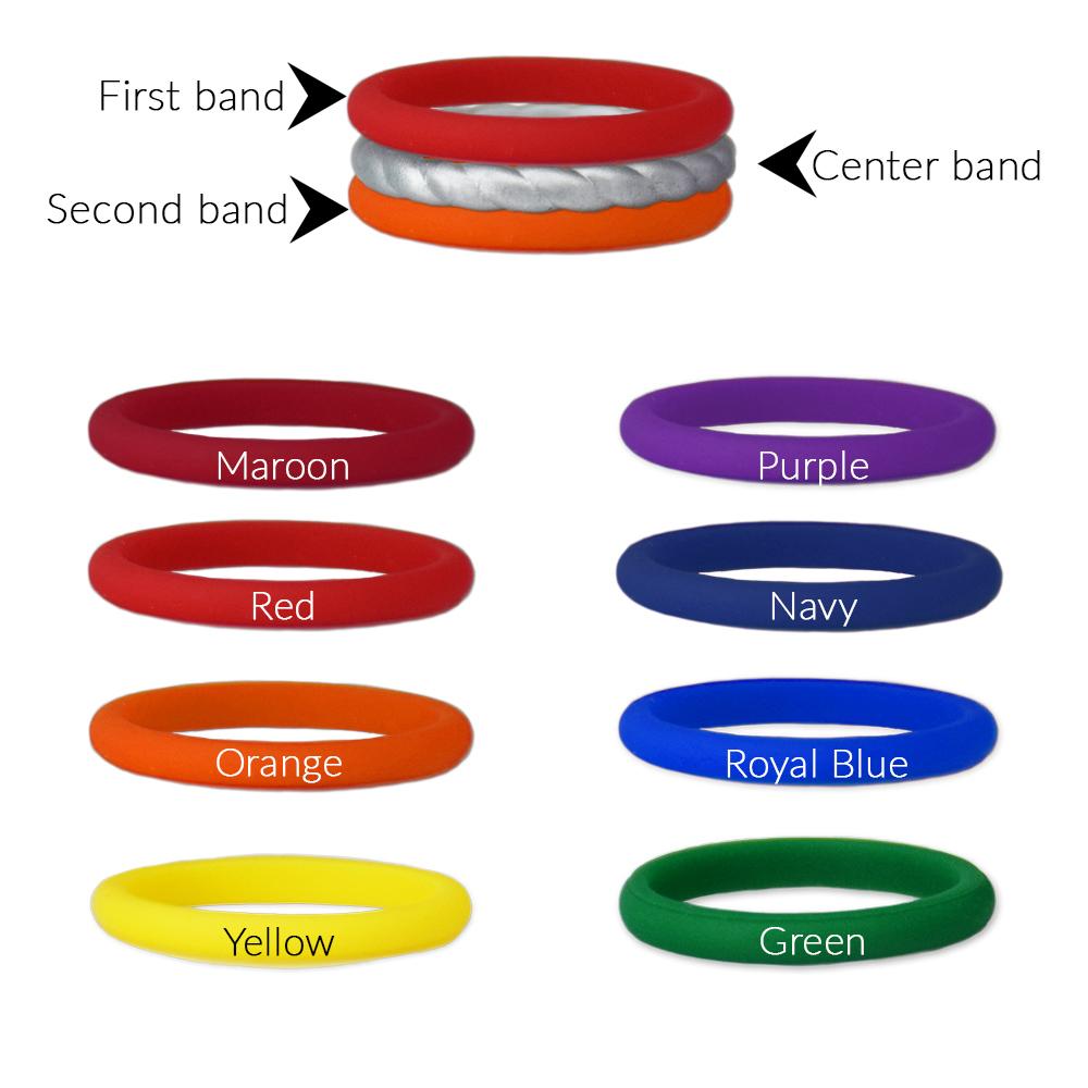 The stackable silicone ring set comes in a size 10 band, but you can choose from various sizes including 4, 6, 8, and 10. Each ring has a height of 3mm, making it a comfortable fit for daily wear. The center band features a beautiful silver rope design that adds a touch of elegance to your stack. The outer bands can be customized in different colors, allowing you to create a combination that reflects your personality.