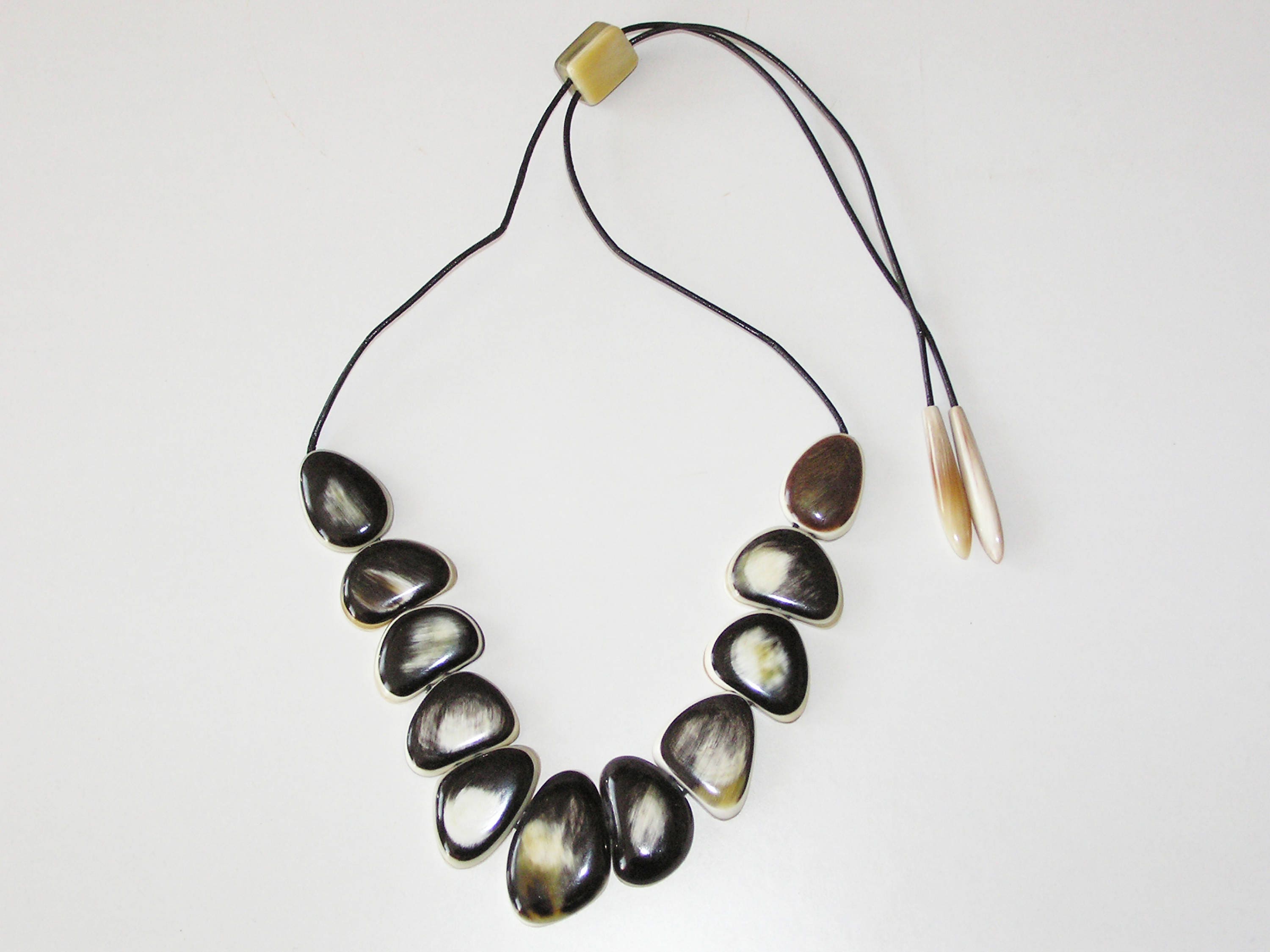 Introducing our exquisite handmade bull horn necklace, a stunning piece of jewelry that showcases the natural beauty of organic materials. This necklace features a unique pendant crafted from high-quality bull horn, known for its rich color palette and intricate textures. Each pendant is a work of art, designed with separate smooth ovals that are brilliantly polished to create a luxurious finish.