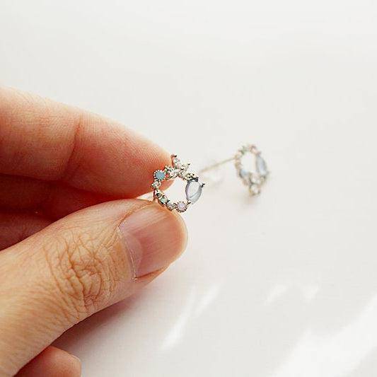 Each earring measures 12mm by 10mm, making them the ideal size for both casual and formal wear. The base of the earrings is made from durable bronze, while the studs are crafted from sterling silver, ensuring longevity and comfort. The light blue crystals are carefully selected and hand-placed, giving each pair a unique charm. Please note that due to the handmade nature of these earrings, the crystals may vary slightly in detail, but this does not affect the overall aesthetic.