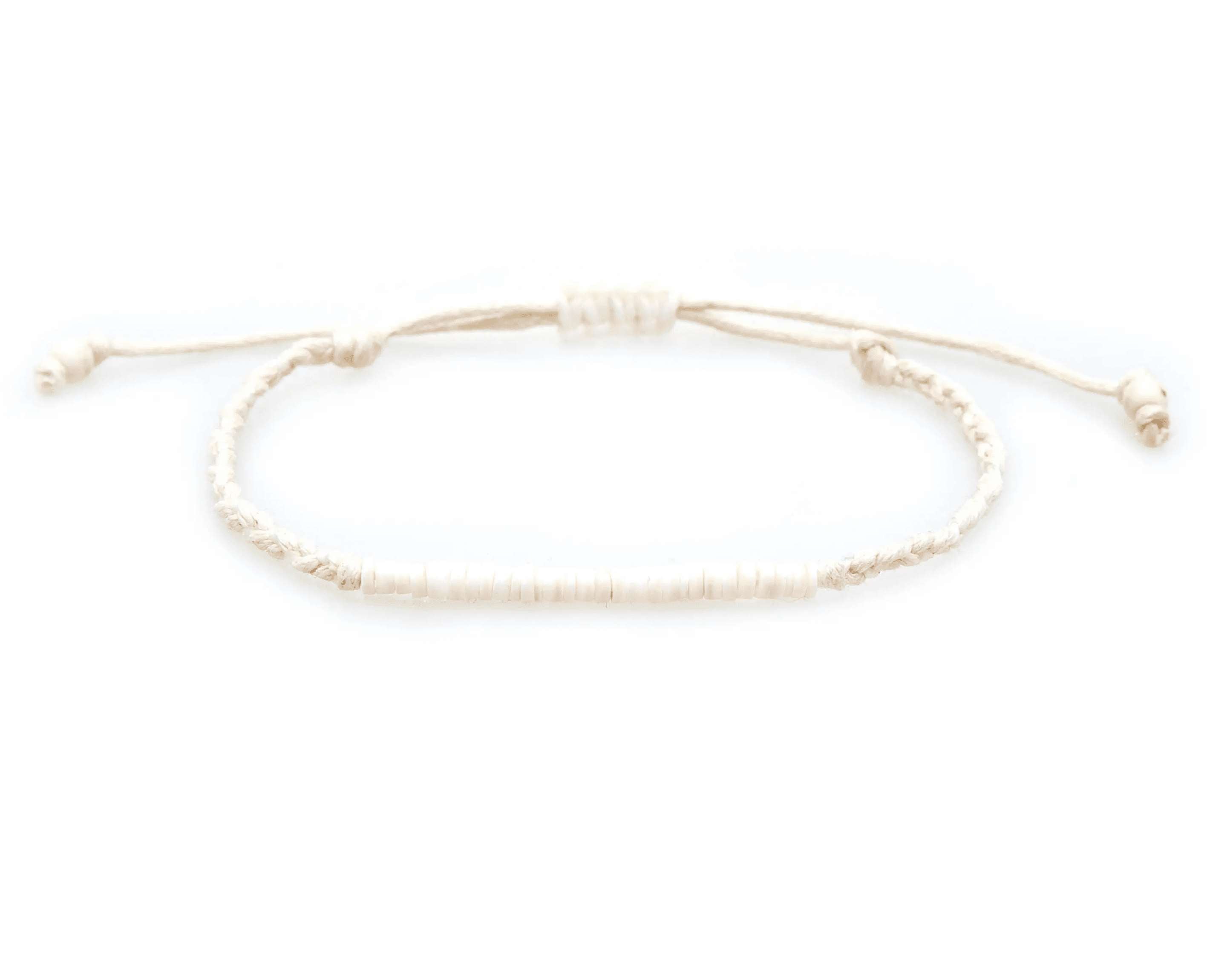 Carissa Braided Puka Bracelet featuring cotton cords, coconut shell clasps, and puka shell beads in natural tones.
