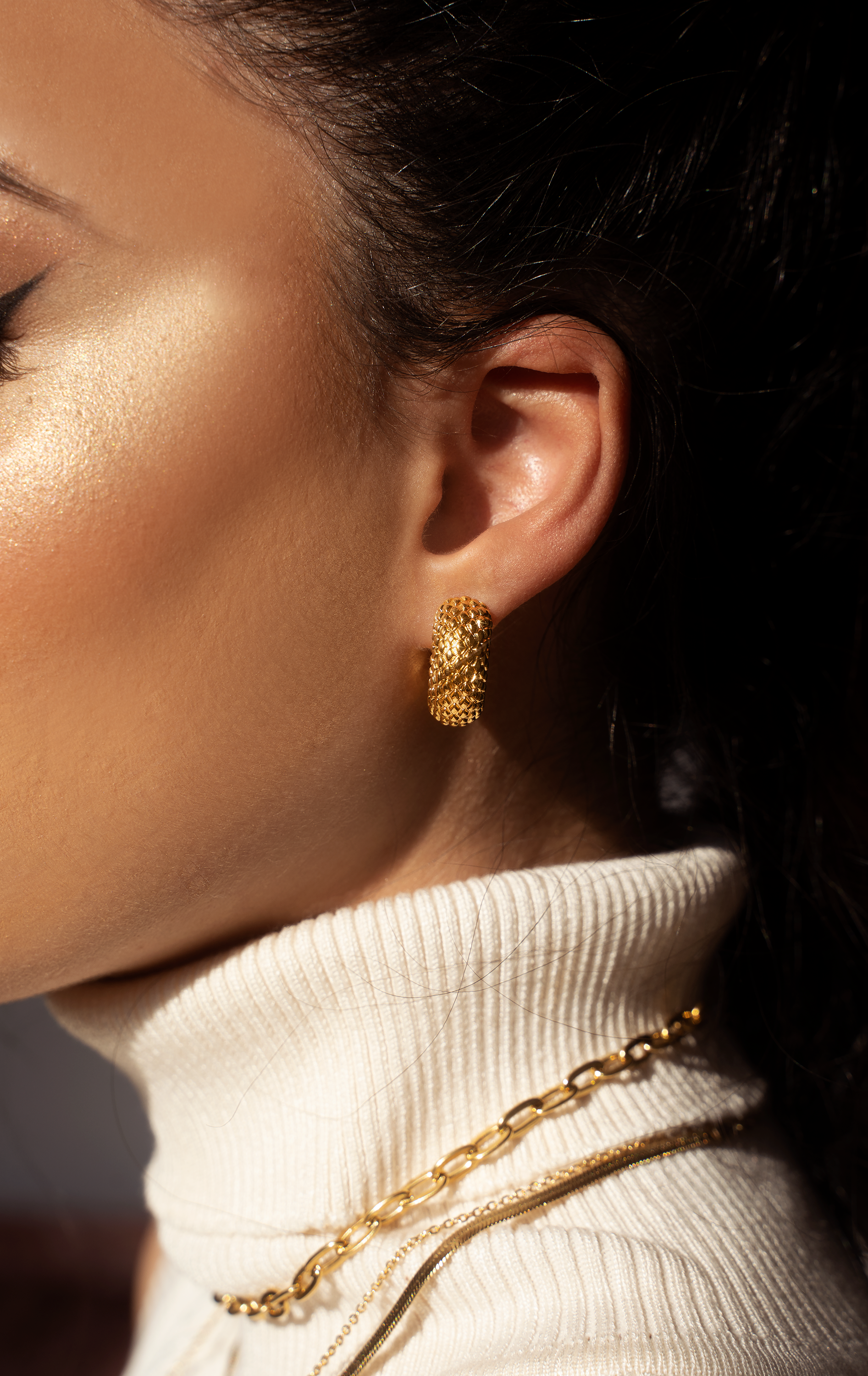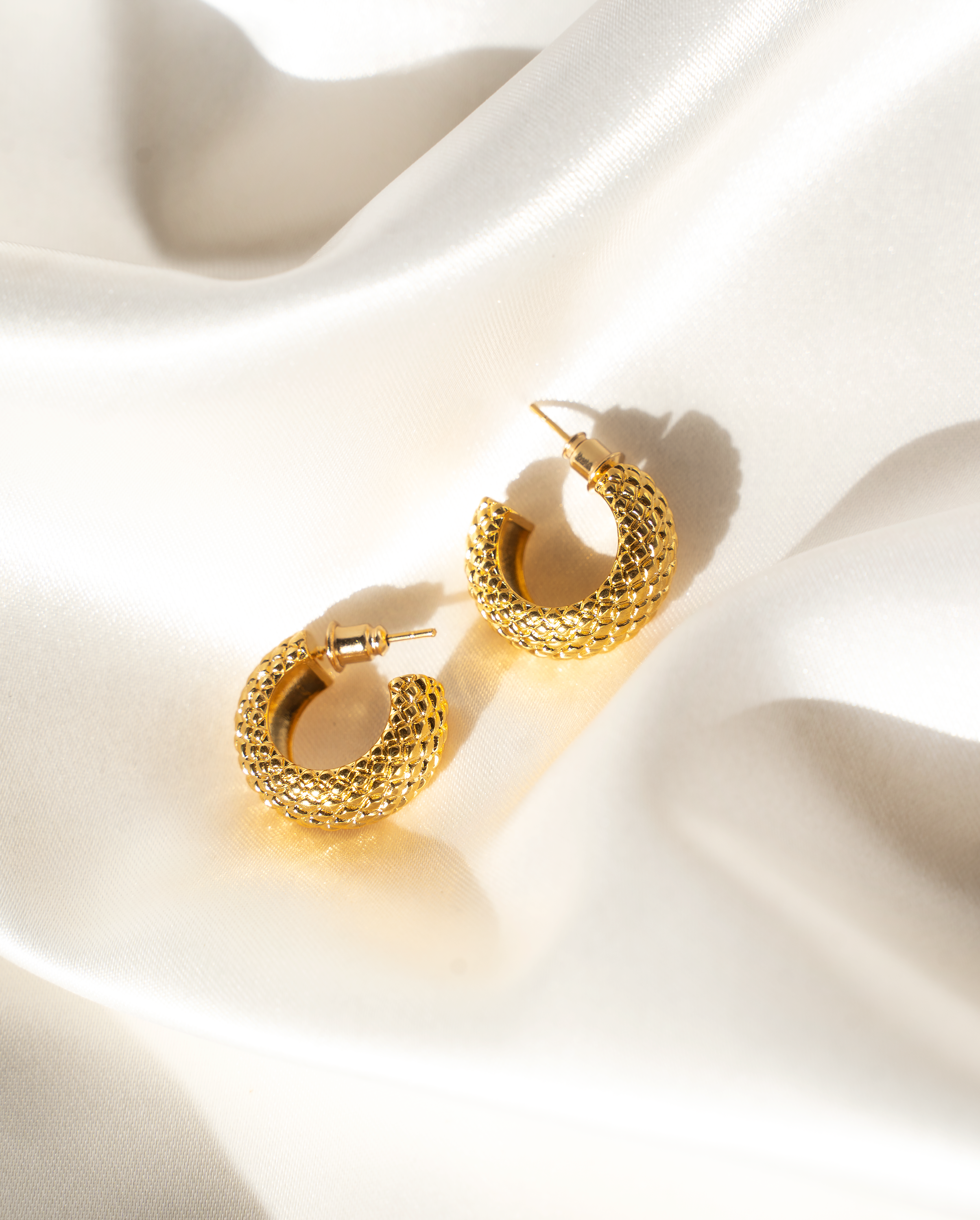 The textured woven pattern of the CIARA Hoop Earrings sets them apart from traditional hoop designs. This intricate detailing gives the earrings a luxurious feel, making them an ideal accessory for both casual and formal outfits. Whether you're dressing up for a night out or adding a touch of elegance to your everyday look, these hoops will complement any ensemble.
