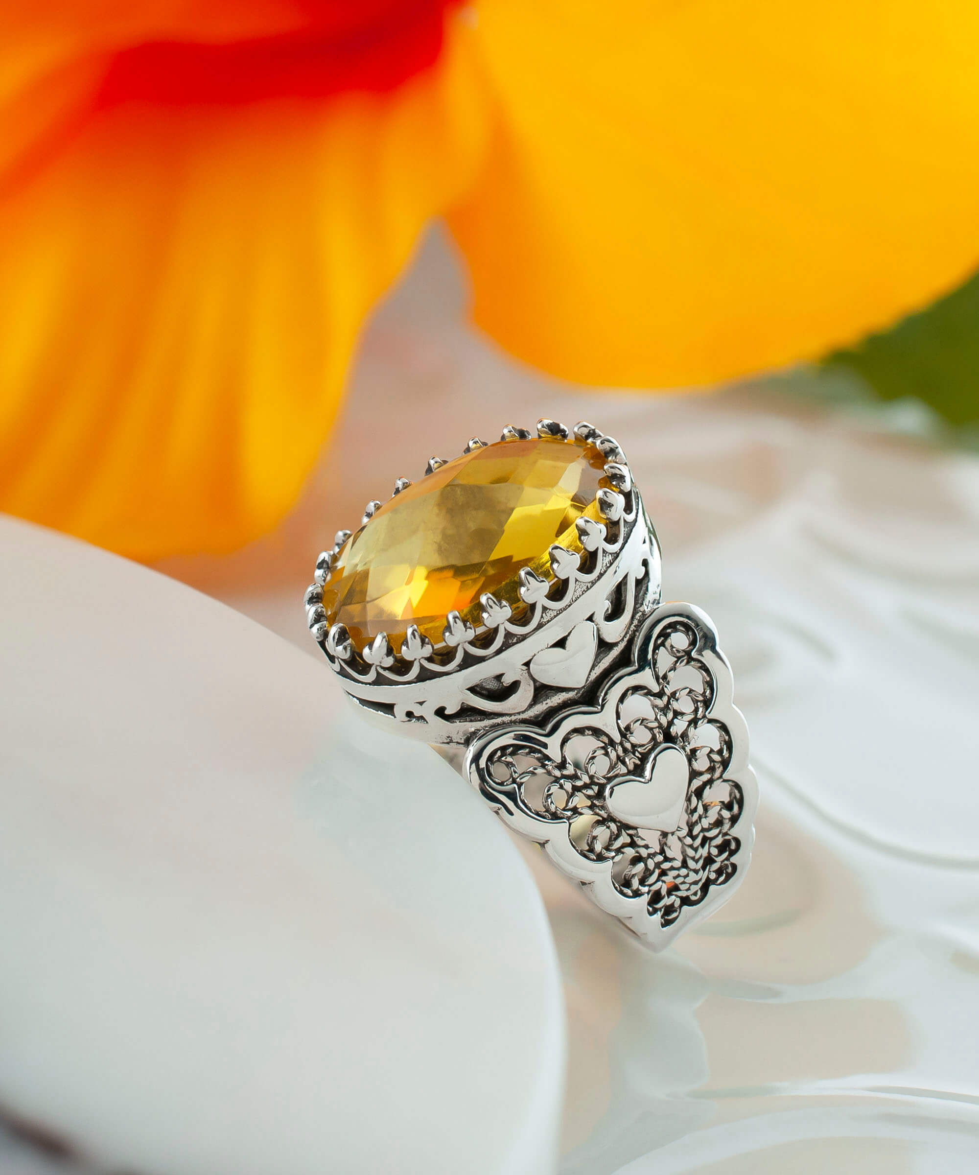 Citrine gemstone double heart filigree art ring made of 925 sterling silver, showcasing intricate metalwork and a vibrant yellow gemstone.
