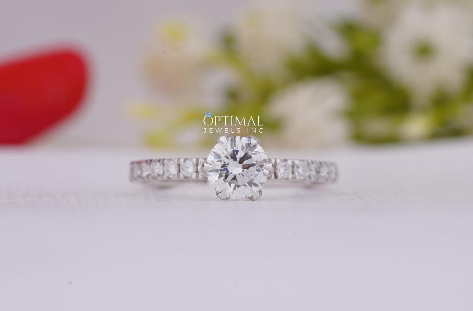 The centerpiece of this ring is a magnificent round cut lab-grown diamond weighing 0.71 carats. It boasts a color grade of F and clarity of VS, ensuring a brilliant sparkle that rivals natural diamonds. The side stones, also lab-grown, add an additional 0.31 carats, perfectly complementing the center stone and enhancing the overall beauty of the ring.