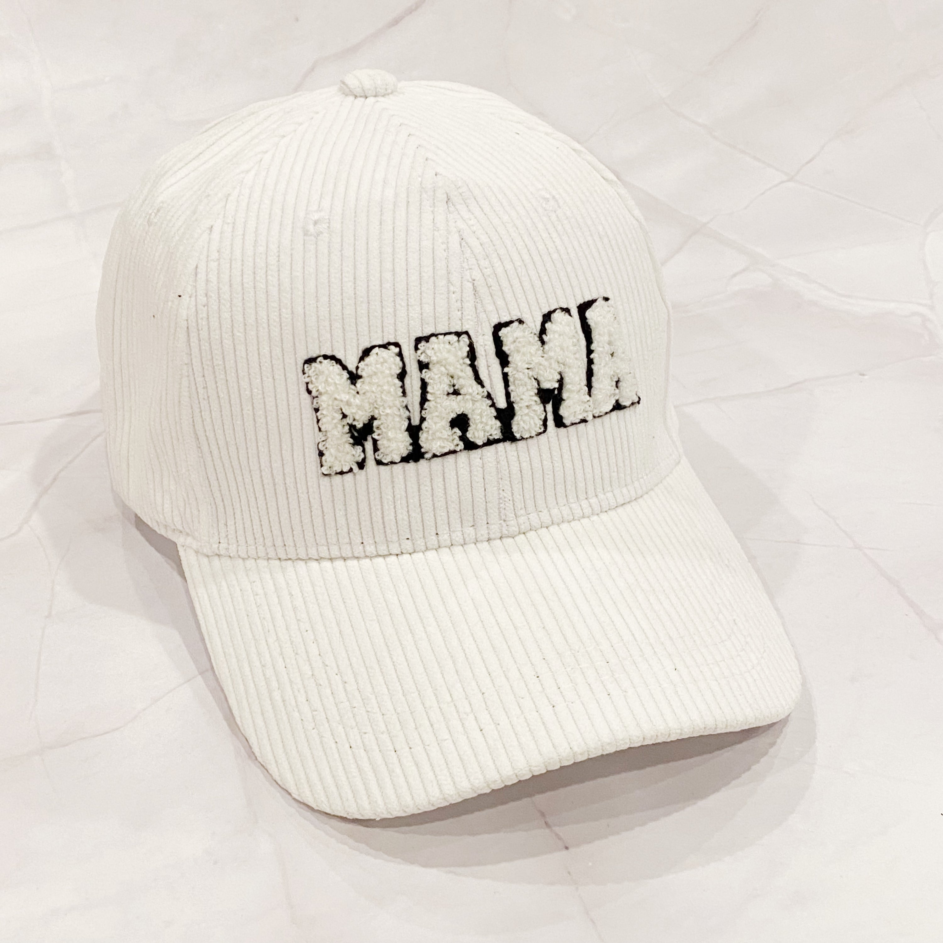 Corduroy Mama Ball Cap featuring fuzzy patch lettering and adjustable strap.