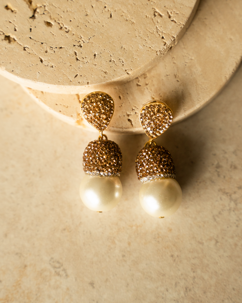 Crafted from high-quality brass, these earrings are plated with yellow gold, ensuring durability and a luxurious finish. The combination of the brass base and gold plating not only enhances the overall aesthetic but also provides a comfortable wear for extended periods. The pearls used in these earrings are carefully selected for their natural beauty, ensuring that each pair is unique.