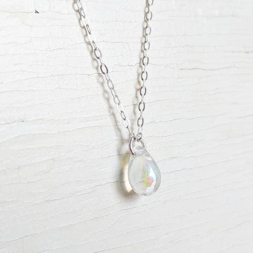 Discover the elegance of our Crystal Raindrop On Sterling Silver Necklace, a stunning piece that combines beauty and sophistication. This exquisite necklace features a gorgeous crystal raindrop pendant that is approximately 8mm long, suspended from a durable 16-inch solid sterling silver chain. The crystal is clear yet boasts a mesmerizing iridescent rainbow finish, allowing it to reflect light beautifully from various angles, making it a perfect accessory for any outfit.