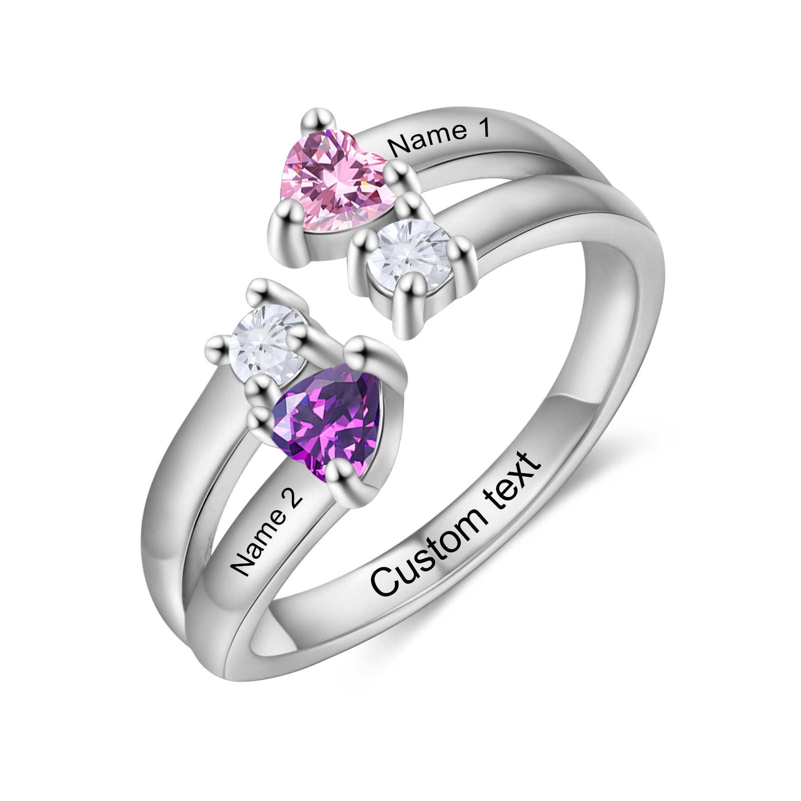 Simply use the 'ORDER NOTES' section during checkout to specify your desired birthstones and any names or text you would like engraved inside the ring. Each name can be up to 8 characters, and the inside text can be up to 18 characters, allowing for a heartfelt message or a significant date.