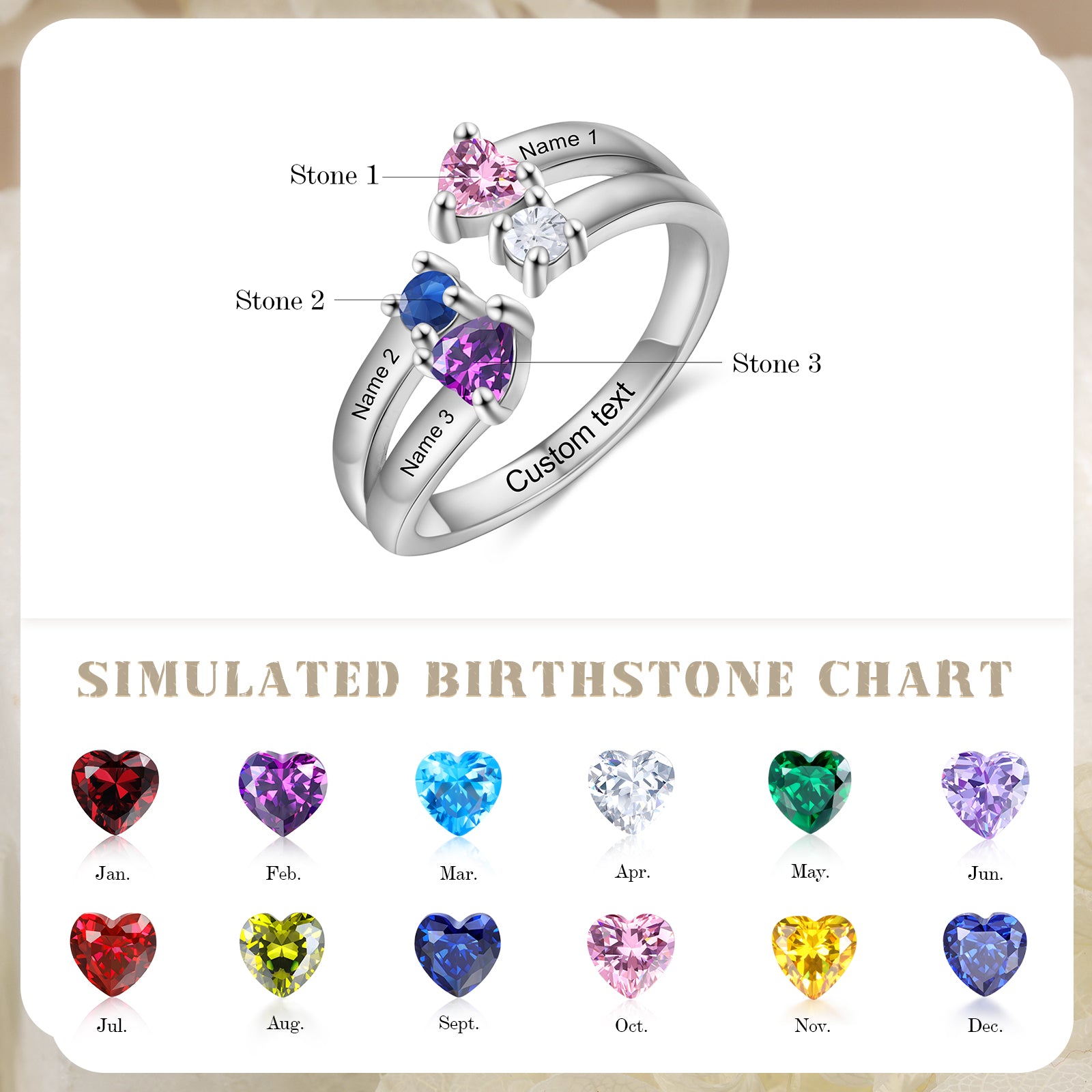 One of the standout features of our Custom Birthstone Ring is the ability to personalize it with up to four birthstones, representing the special people in your life. Whether it's for a birthday, anniversary, or just because, this ring can be customized to reflect your unique story. You can choose from a variety of birthstones, including:
