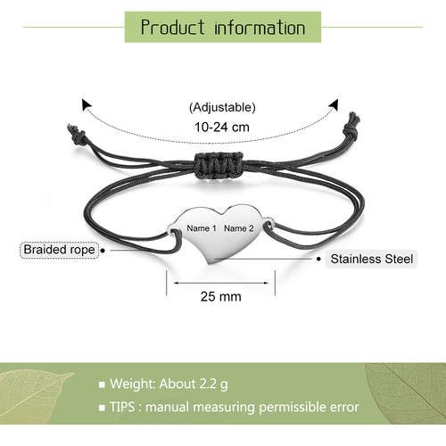 In summary, the Custom Engraving Stainless Steel Heart Bracelet is a stylish and meaningful accessory that allows for personal expression. With its high-quality materials, adjustable fit, and lightweight design, it is perfect for anyone looking to add a touch of elegance to their jewelry collection. Don't miss out on the opportunity to create a personalized piece that reflects your unique style or the special bond you share with someone you love.