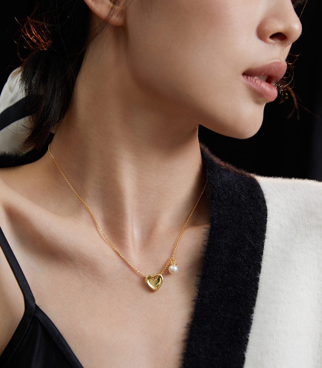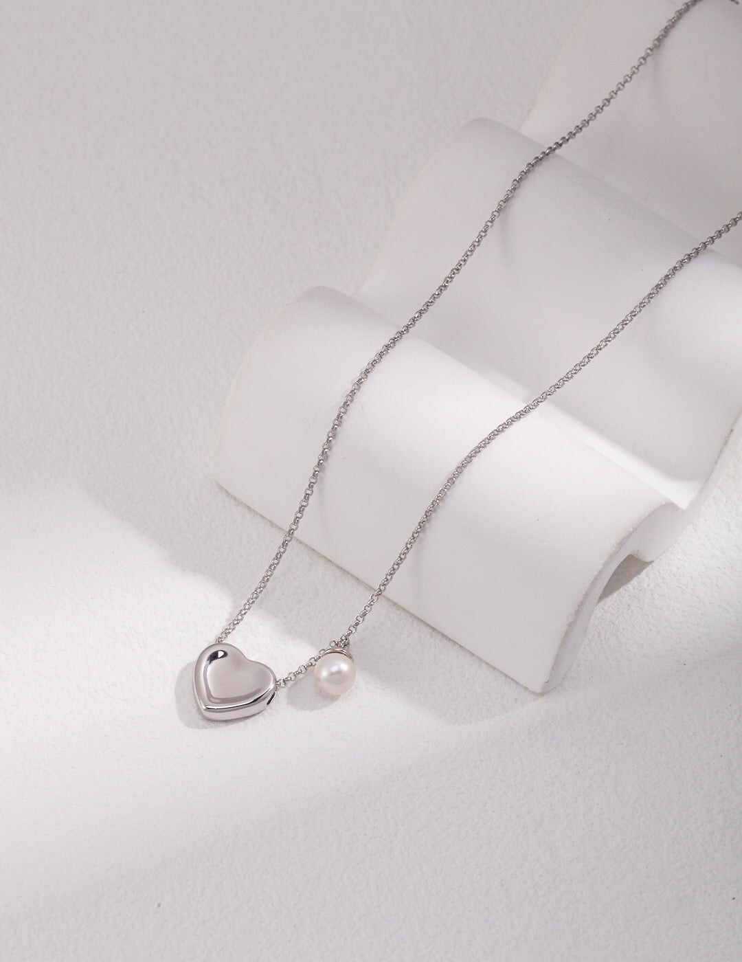 A delicate Dainty Heart Necklace featuring a heart pendant and a genuine freshwater pearl, elegantly crafted in sterling silver and gold vermeil.